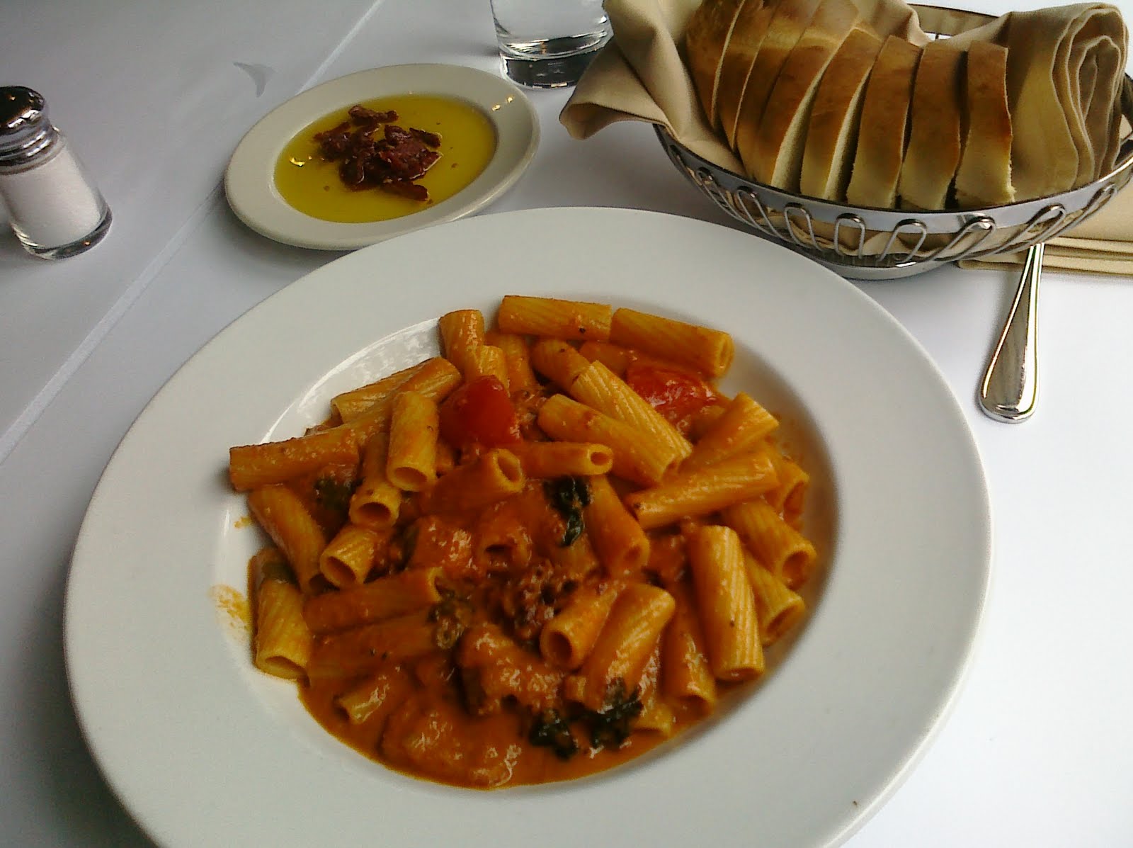 Maya had the rigatoni with Italian sausage and a cream tomato sauce, which she said was very good. She’s fairly discriminating with her pasta, so I’m glad that she enjoyed it as much as she did. I would have expected her to order the butternut squash ravioli, as we have had that at home before, but she wasn’t in the mood for that. Perhaps too sweet.