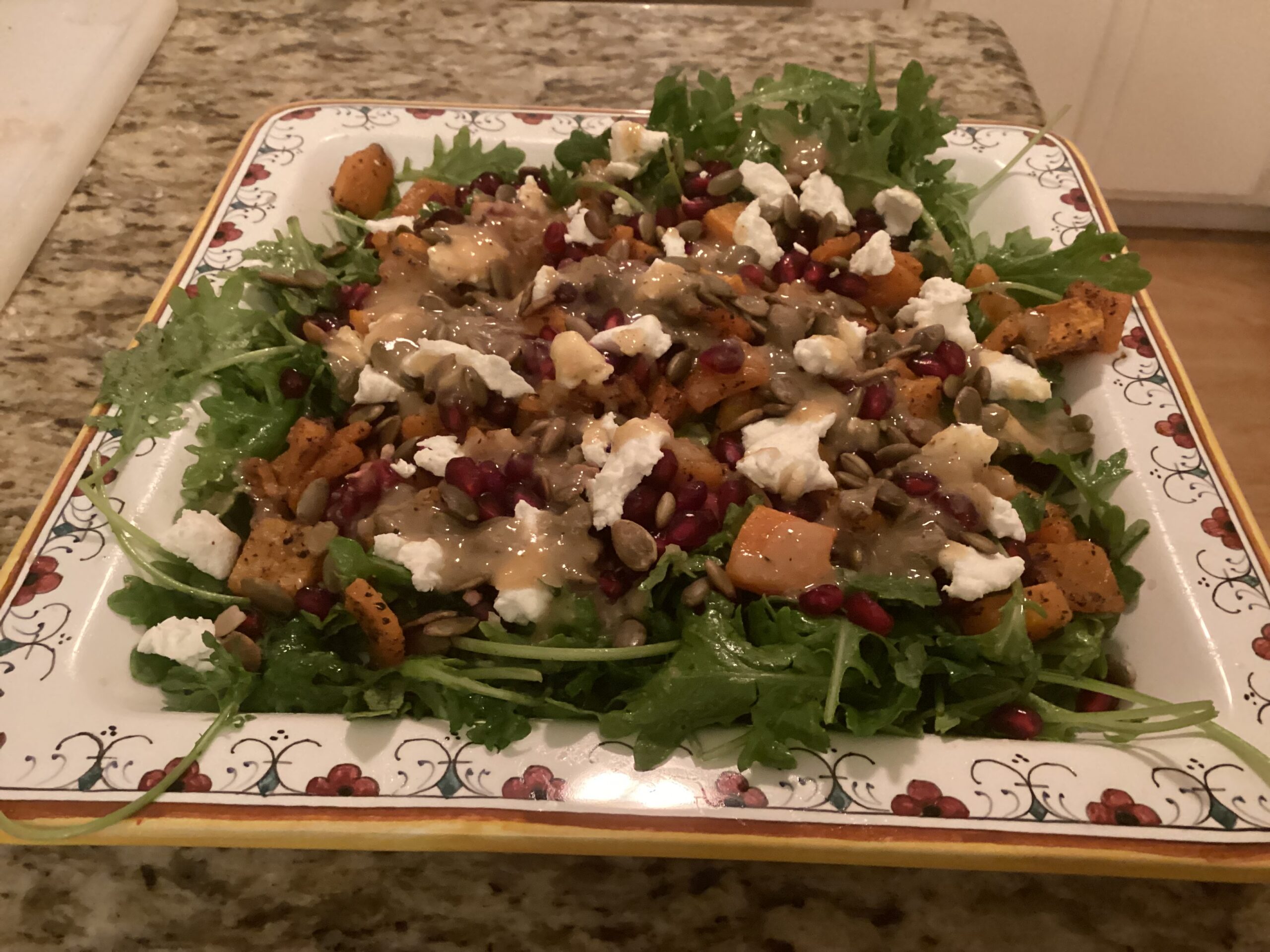 I saw this recipe on Facebook the other day, and thought it might be a good use for some pomegranates that I might swipe from neighbors’ trees on my morning walk. Imagine my surprise when I discovered that they had harvested their trees and there was nothing for me to swipe! Oh well, I went ahead and bought one, along with some already cubed butternut squash, and I went for it. Mistakes were made. For one, I overdressed my salad. The dressing is brown and kind of thick, so my picture isn’t nearly as pretty as the original. Second, I think I cut my squash a tiny bit too thick, and I used too much oil, and crowded my pan. It didn’t brown or get crisp, it steamed. Looking at her recipe, maybe it never would have gotten crisp, maybe squash doesn’t do that? But it didn’t brown. Third, I think my dressing could have used more salt. I went easy on the salt because the squash and pepitas were already salted. It was lacking a bit. Also, I thought I had sherry vinegar, but I didn’t. I used golden balsamic, which was nice, but I would like to try it with sherry vinegar. I used baby kale. I will try this recipe again and see if I can correct these issues, because while it wasn’t as good as I wanted it to be, it was still pretty good.
