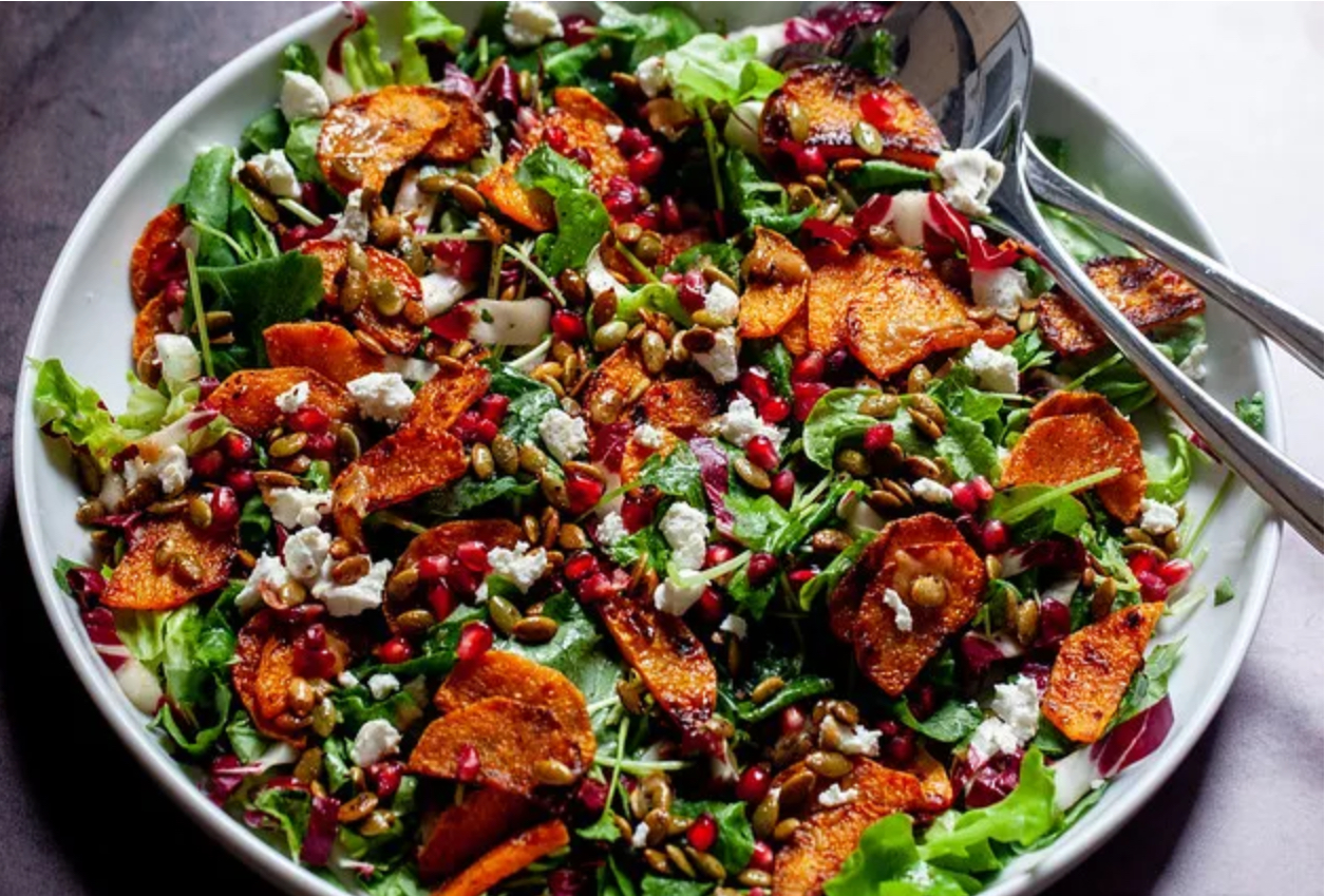 In a large wide bowl or salad plate, toss greens with half the dressing and season with additional salt and pepper. Arrange roasted squash over the greens, fanning out slices if you wish. Sprinkle salad with pomegranate, goat cheese, and pepitas and drizzle some of the remaining dressing over, to taste. Serve right away, with extra dressing on the side.