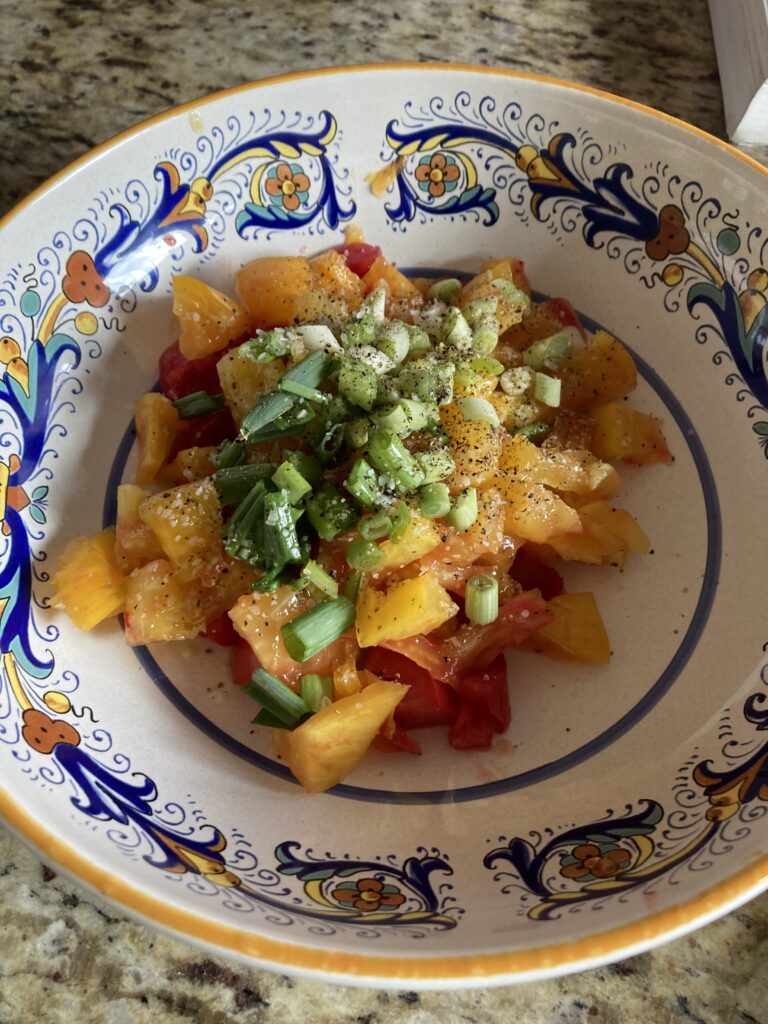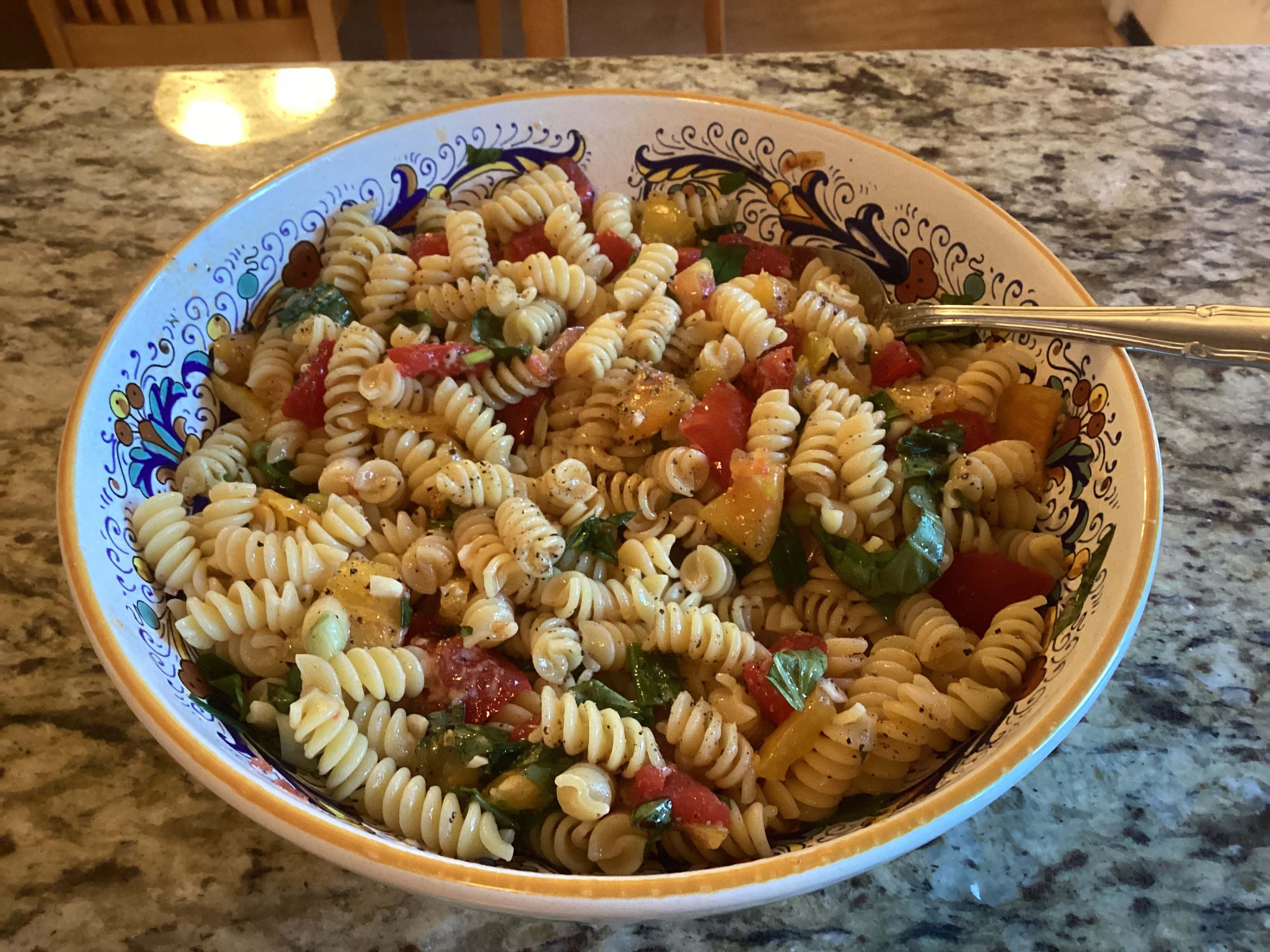 I had planned to make chicken soup for dinner the other night, but then Ted told me he had to work very late and wouldn’t be home. I decided to save the soup for the next night, and make pasta for Maya and myself. I had a few beautiful tomatoes from the farmers’ market, so I decided to make this pasta, which uses uncooked tomatoes. You combine the sauce ingredients early in the day, and let them sit on the counter until you are ready to eat, then you cook your pasta. (Observant readers may notice a phone in the pic above, with Mulder’s picture as my background. That’s my work phone, and I have it there so I can keep my Teams status as green while I do this. I can also watch and see if anything comes in via email, because the entire reason I’m downstairs cooking is that there is a break in the action and I have nothing to do.)