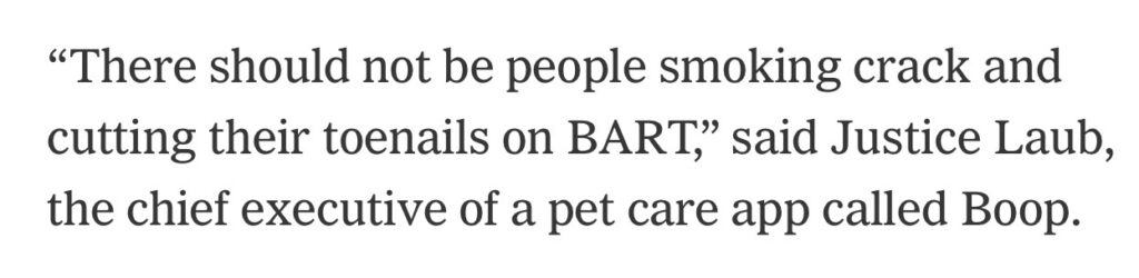 I was reading an article in the NY Times the other day about the financial woes of our local transit systems, and came across this quote. I had to wonder, is Mr. Laub referring to one person who was smoking crack AND cutting their toenails? Or are these separate incidents? To be clear, I have absolutely no desire to see anyone cut their toenails in public, but it’s not exactly on par with smoking crack. I did a little google search (why didn’t I just look at the article?) to find a picture of Mr. Laub with his dog…are dogs allowed on BART? And found this amazing Reddit conversation.