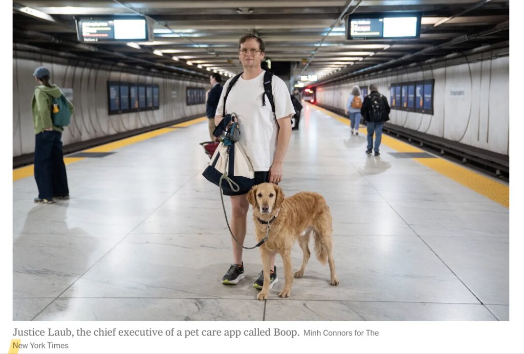 Turns out that yes, dogs are allowed on BART – Service dogs on a leash, and pets if they are contained in an appropriate pet carrier. Emotional support dogs are considered pets, not service animals. I would argue that this dog is lovely and very sweet, but that unrestrained dogs are more dangerous than people cutting their toenails. I would MUCH rather see the dog, but Mr. Laub is clearly flouting the rules himself.