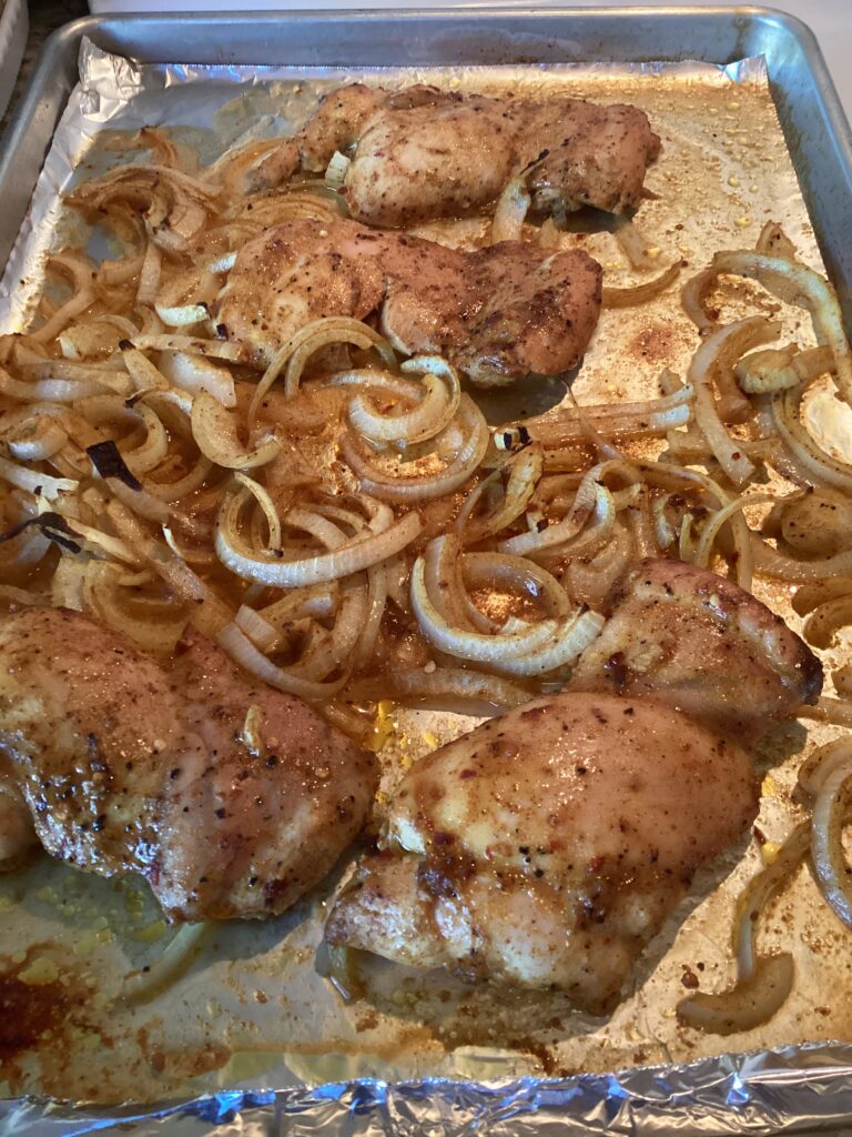 Suzanne mentioned making this recipe and I decided to give it a try. I feel like one of those people who comments on a recipe and says ‘I didn’t have sugar so I subbed in tuna, not a fan, 1 star.’. I mean, I didn’t do anything that dumb, but the recipe says to cook your chicken in a 425 oven for 40 – 45 minutes. That sounded like too long to me, so I took it out when it hit an appropriate internal temperature. It didn’t brown or get crispy bits, even though I had it under the broiler for the last 5 minutes or so. I don’t know how long I had it in there, actually, but when I cut into it, it was juicy and very tasty, but just barely done. Likely if I had left it in for 10 more minutes I would have had better luck. I used boneless skinless thighs, so drying out wouldn’t be too much of an issue. I made a double batch and froze 1/2 in the marinade, so future me won’t have to figure out what’s for dinner. I think I might try grilling it outside next time. My oven is touchy and doesn’t do the best job browning things.
