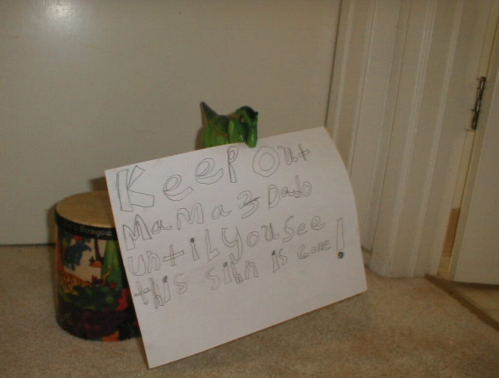 Dinosaurs always remind me of Maya, who has always loved them. Sure, she’s 30 in just over a week, but still enjoys watching shows supposing the asteroid hadn’t hit and killed most of the dinosaurs. I remember when she was really pissed at us for something or another, and wrote a sign telling us to KEEP OUT, and put it in front of her door with her drums and her T-Rex.