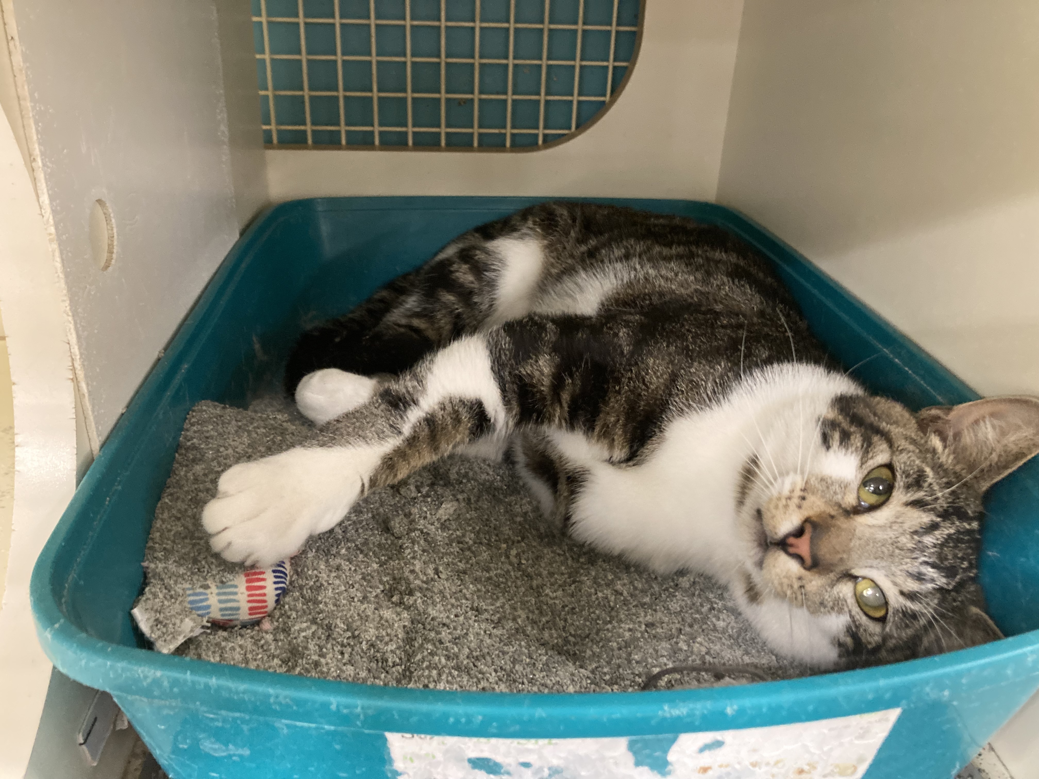 This is Pinocchio, the newest cat at the rescue. He hangs out in his litter box, which is disgusting and also a sign that he is stressed. Poor thing. He’s not blind in one eye, that’s just the camera angle. I think his story is that his people moved away and just…left him. What the hell is with people?
