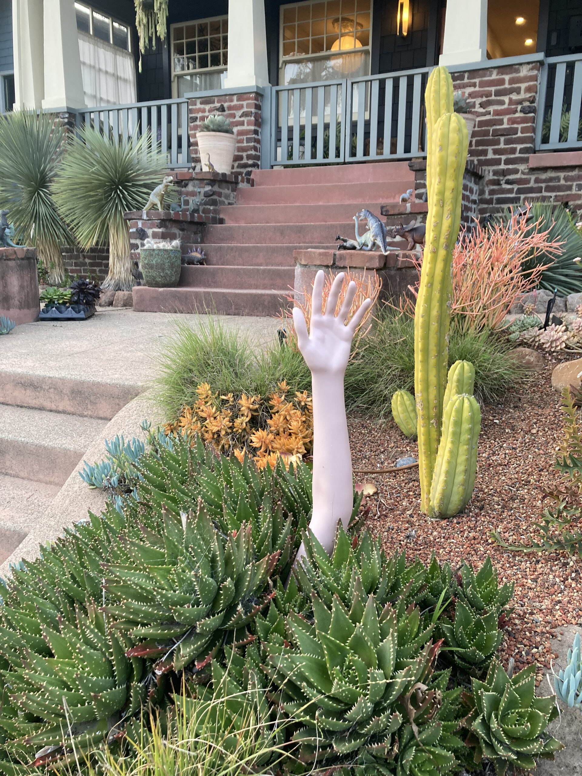 Last Friday, Ted and I went to dinner in Oakland, to one of our regular spots. It’s a beautiful neighborhood (Rockridge, for folks who know the area) with lovely old Craftsman homes surrounding a bustling street of restaurants, book stores, boutiques, etc. I would buy a house there in a heartbeat if I had a million or two more in my bank account. I mean, I’d buy a beautiful old home and then renovate the electricity and plumbing so it doesn’t fall apart. Maybe I’d buy this house, but the arm has to come with the deal. Also the dinosaurs up the walkway.