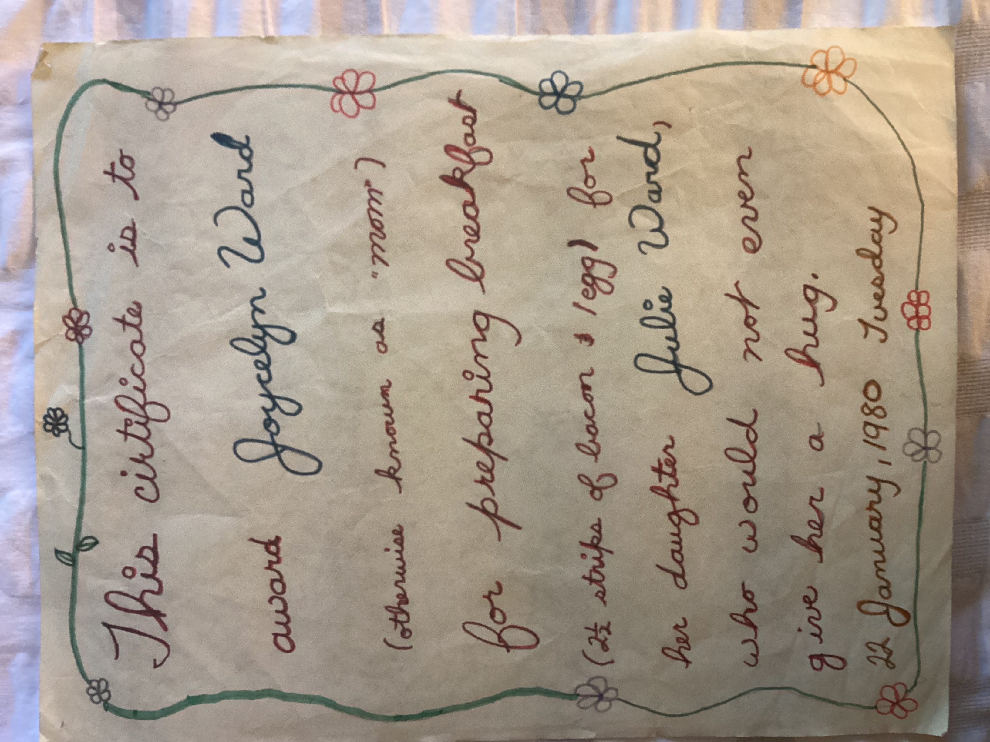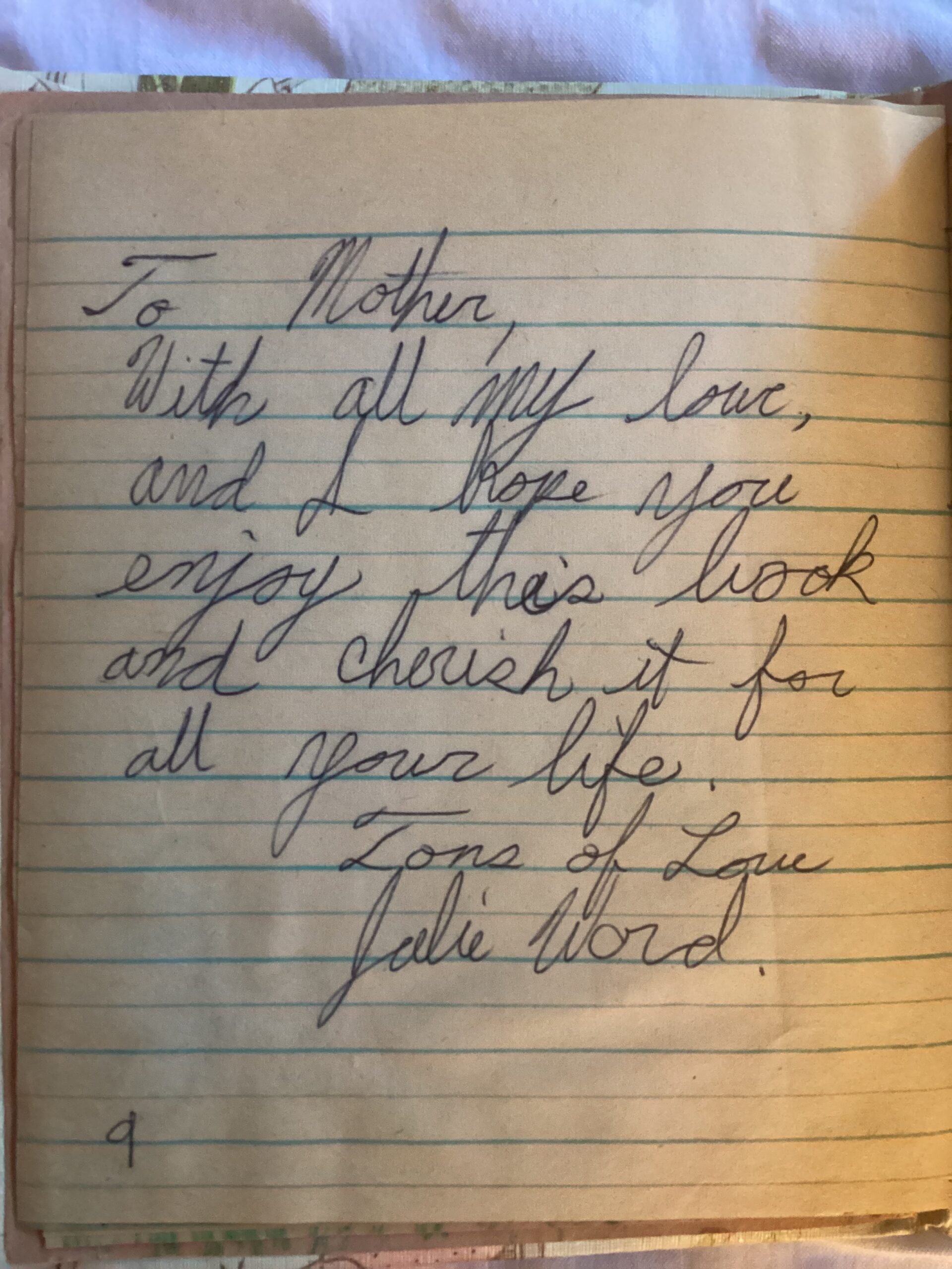 Also a book that I made in second grade, about a horse named Beauty who was banished from his herd, only to be captured by Indians, from whom he quickly escaped, reunited with his herd, and was never seen again. A happy ending for sure, who wants to hang out with people? A few years later I gave it to my mom as a gift to cherish for all her life. I don’t ever remember calling her ‘Mother’, but I guess I was trying it on, like cursive and my new last name. We went from her married name back to her maiden name when I was about 10, so I signed everything ‘Julie Ward’, even birthday and Mother’s Day cards. I was a weird kid.