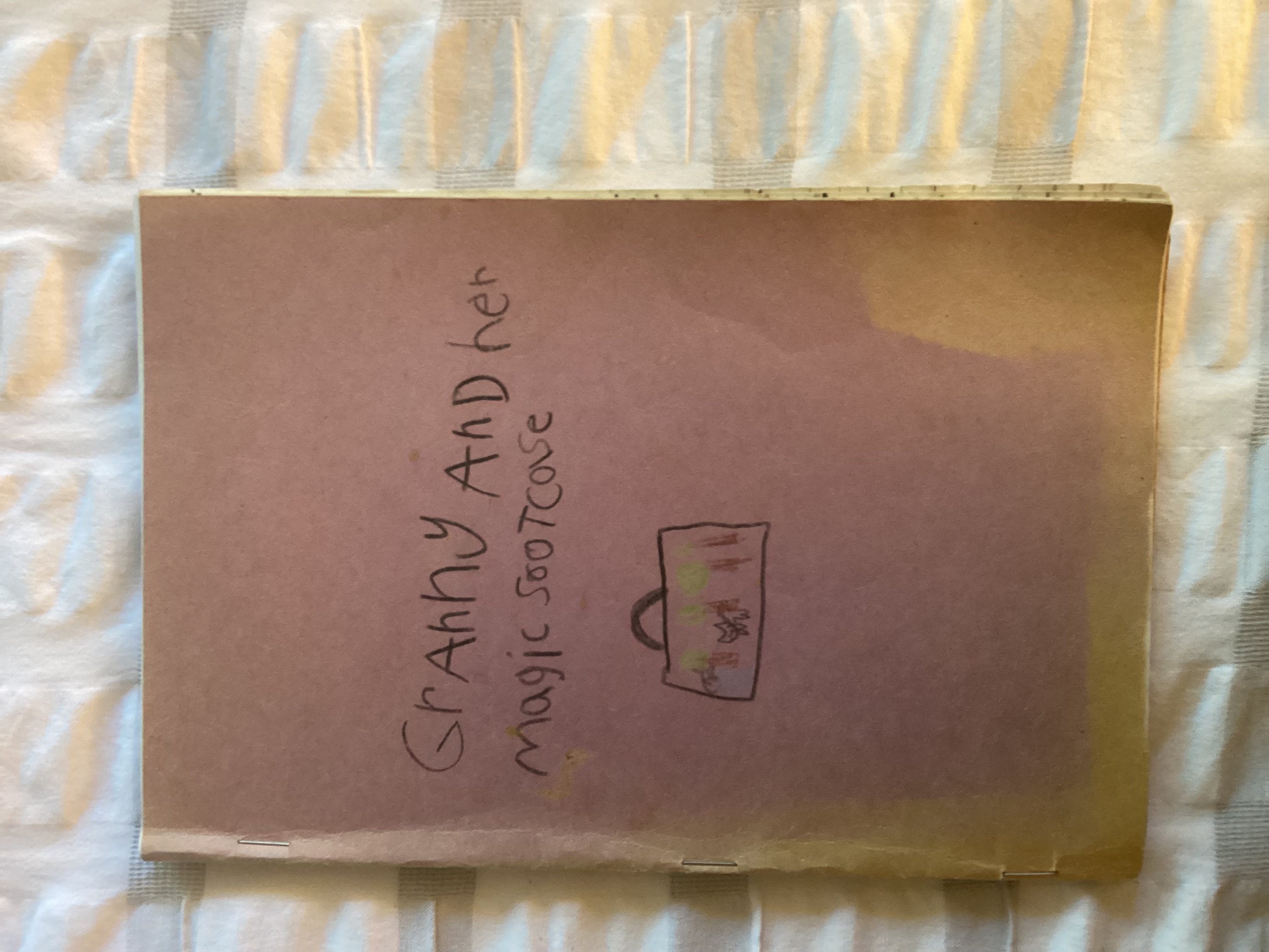 Another treasure, a story that Maya wrote for my mom, ‘Granny and her Magic Sootcase’. Maya was learning to read and write phonetically at the time, so the spelling is pretty interesting in this book. It’s about a time when Granny came to California to visit from Juneau*, and she brought the following items with her in her magic sootcase: The mountains, a whale, the forest, Uncle Richard, Auntie Kathy, and their three cats. It’s pretty cute, with Granny exclaiming things like, “Oh My! This Mountain is MUCH too large for your little house!”