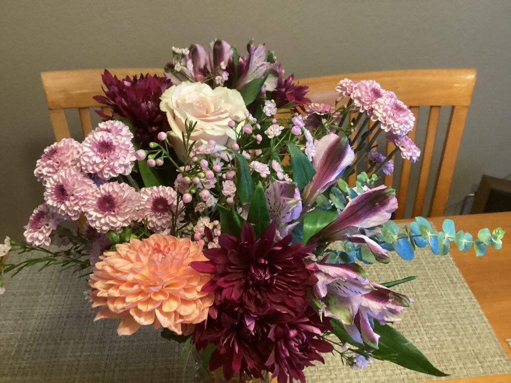 Sunday started with a trip to the Farmers’ Market, then my cousin’s daughter, Grace, came by for dinner. She is almost 18, and has just moved up from SoCal to attend UC Berkeley. One thing I love about Grace is that she is using both sides of her brain so well. Like many of our blogging friends, she is both STEM and arts inclined. I feel like I am NOT that way, so it always impresses me when someone is. She went to an arts High School, and is pursuing Astrophysics in college. Amazing. Anyway, she is a delight and we enjoyed her company and are looking forward to getting to know her more. She brought us the beautiful bouquet above.