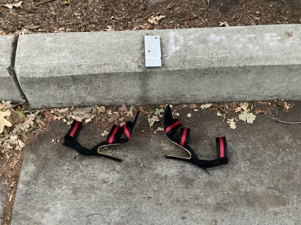 Bravo to whoever ditched the shoes! The only mystery is how they were able to wear them long enough to get outside.