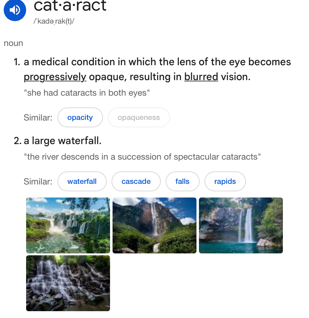 I’ve learned a couple of things recently. First, from the Connections game on The New York Times, is that the word cataract can mean more than cloudy eyes.