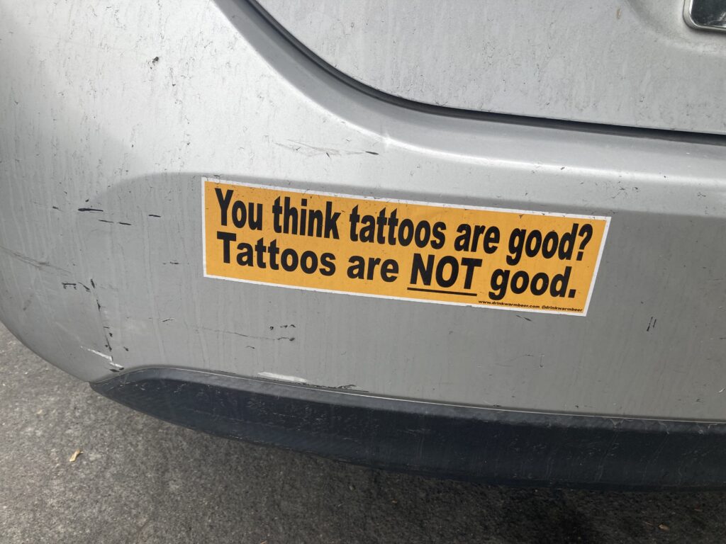 I love the bumper sticker! It should be mandatory in tattoo shops. It could help people from making mistakes. Like, if you thought tattoos were not a good idea, you might divert. But if you’re response was, “Hell yea, tattoos aren’t good. They’re great!” then youd know you were in the right place.