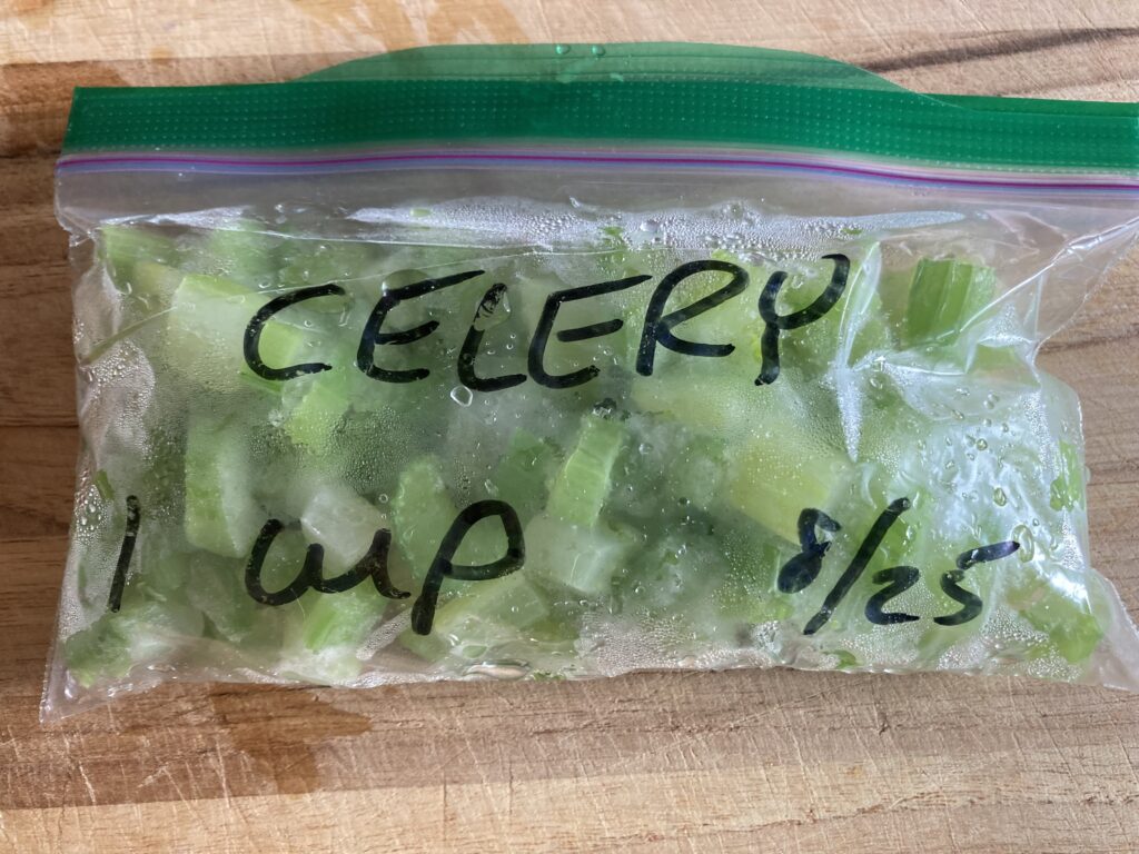 The second thing I learned was that you can freeze celery. This is great news, because we don’t really like celery much, so we don’t snack on it, with peanut butter or hummus or cream cheese or plain. Occasionally if I have some laying around, I might put it in a smoothie. But mostly we use it for recipes. The last time we had a bunch laying around, I did a little internet search and found that you can freeze celery for recipes. I chopped it up finely, blanched it quickly, cooled it quickly in ice water, then let it dry out, and froze it. Perfect for the chicken soup I made this week, really nice to not have to buy more.
