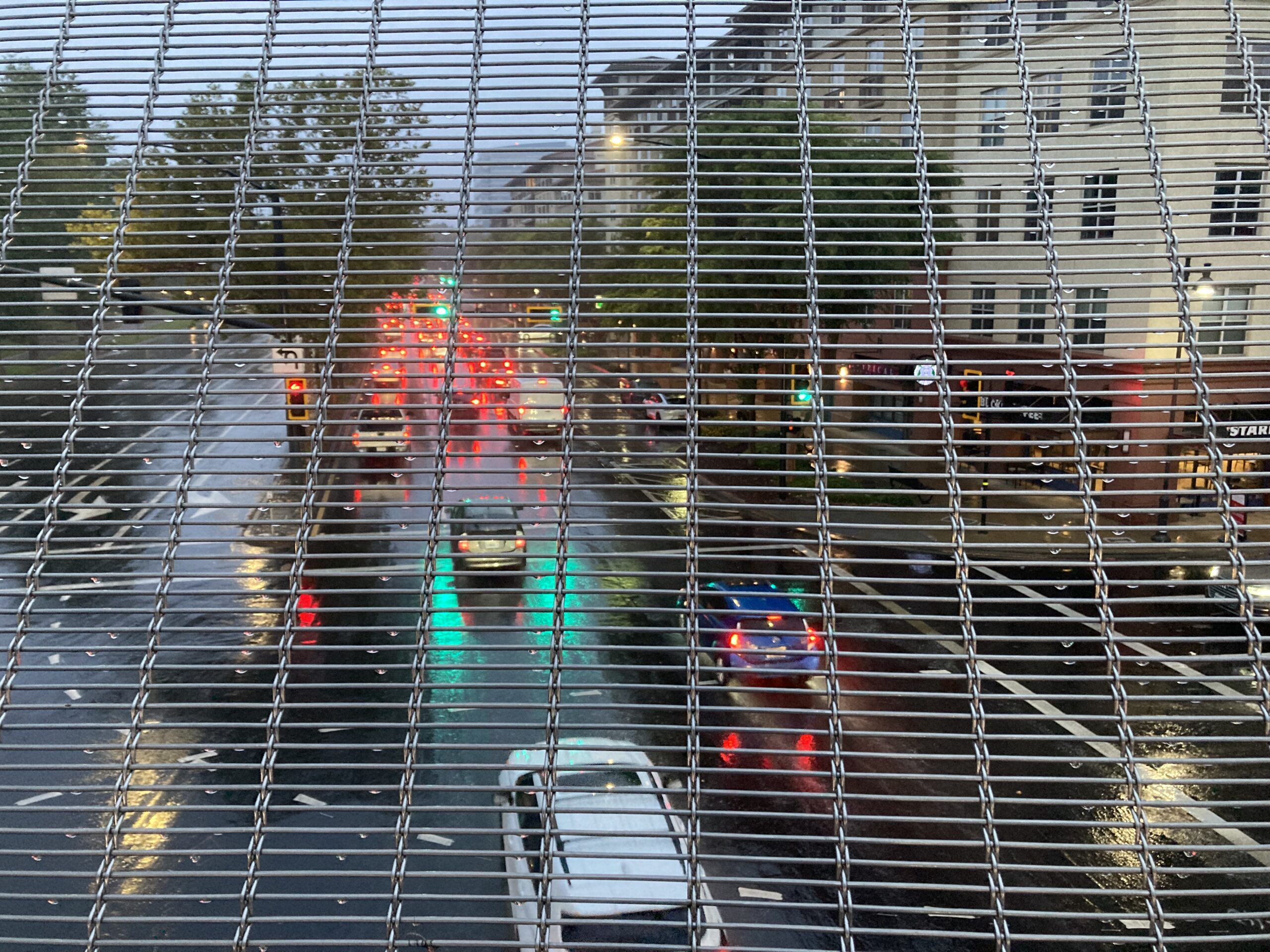 Yesterday was a rare rainy morning. We live close to a pedestrian bridge spanning a very busy street. This is looking down at the traffic going towards the freeway, and includes our closest Starbucks. This is about 2 blocks from our home.
