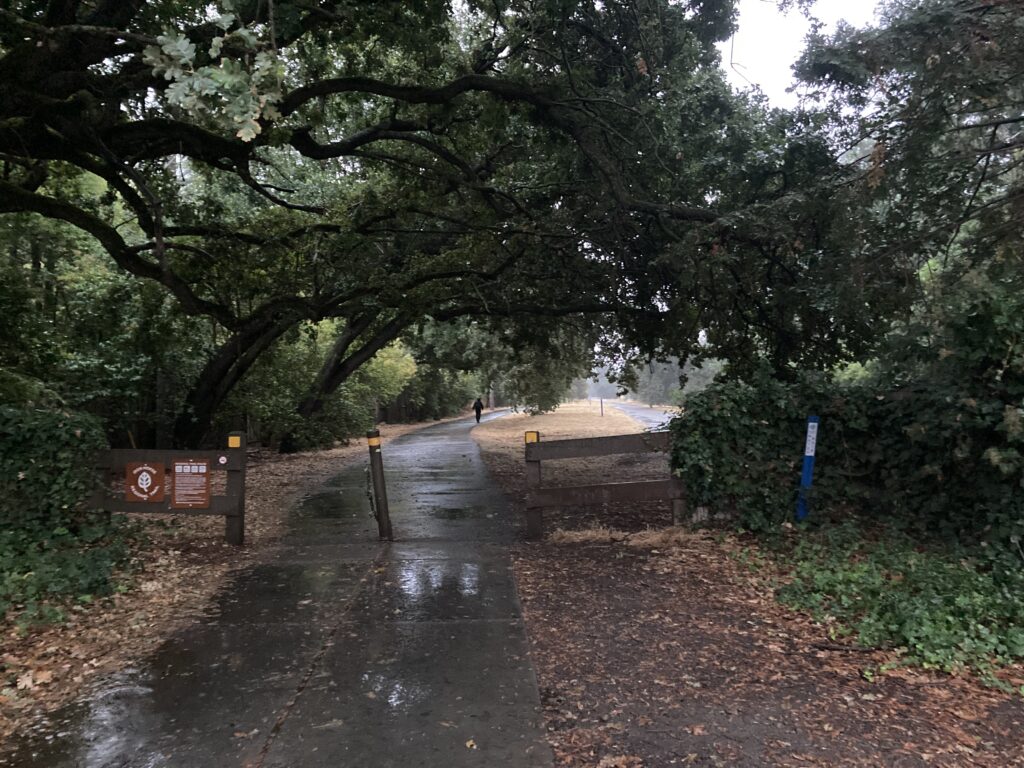 A bit past the bridge is a regional trail, which is often busy with pedestrians, bicyclists, and (sadly) scooters and electronic bikes. I love the canopy of the oak trees leaning over the trail at the entrance. This was also yesterday, and the rainy morning was lovely, rare, and welcome. Alas, it cleared up after only a couple of hours and it may be quite a while before we get more.