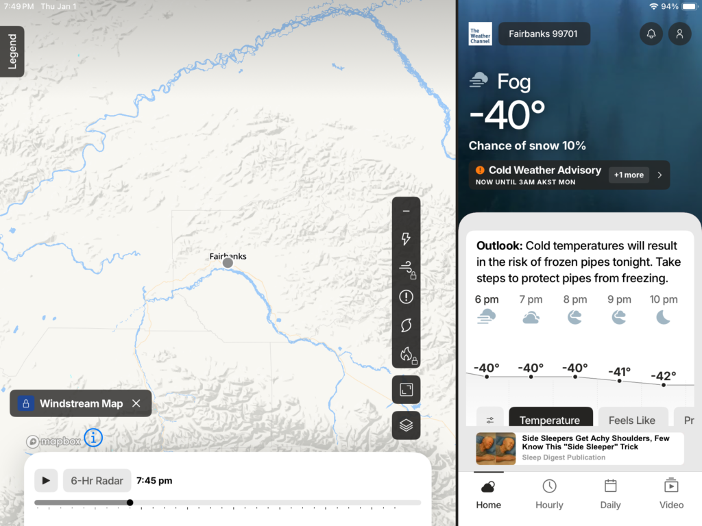 In other other other news, look at the weather in my old hometown of Fairbanks, Alaska. They are going through a shitty cold snap right now. Not good. You have to plug in your car at night to keep the engine from freezing, the energy bills are through the roof, and you can’t leave the house. We left Fairbanks when I was 9, so I don’t remember a lot of this particular bullshit, but sometimes I pop in and see how things are going this time of year, and I get little cabin fever flashbacks.