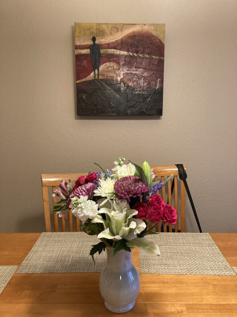 Pretty flowers from Ted for my birthday, with my friend Nadine’s painting in the background.