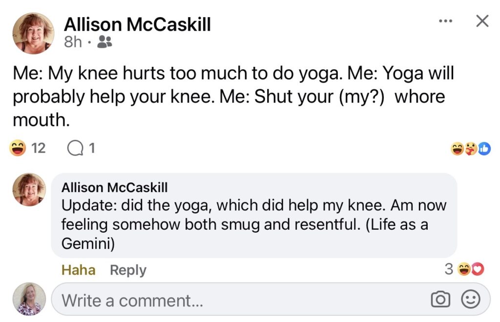 Mondays and Thursdays are my rest days from strength training, and it always makes me SO HAPPY to not have to do that boring chore on a Monday morning. I have a 7:30am meeting for work on Mondays, which is stupid, but I don’t have to look at a screen too much and just call in from my phone on my morning walk. Excellent. I’ve taken to listening to audiobooks while I do my weights. It makes it SO MUCH BETTER. Even better than listening to music, for me. Ted has recently started doing some Caroline Girvan videos, he says she looks like she’s computer generated. Fair.