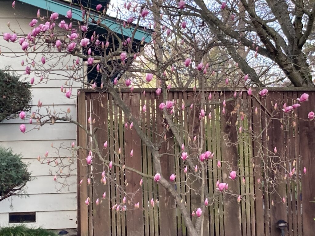Last week I mentioned that the tulip trees in my town were not yet blooming, but then later that very day I went downtown and saw a glorious huge tree in full blossom. I was driving though, so no picture, but let’s compare apples to apples anyway, this is the flower progress on the same tree from my last post.