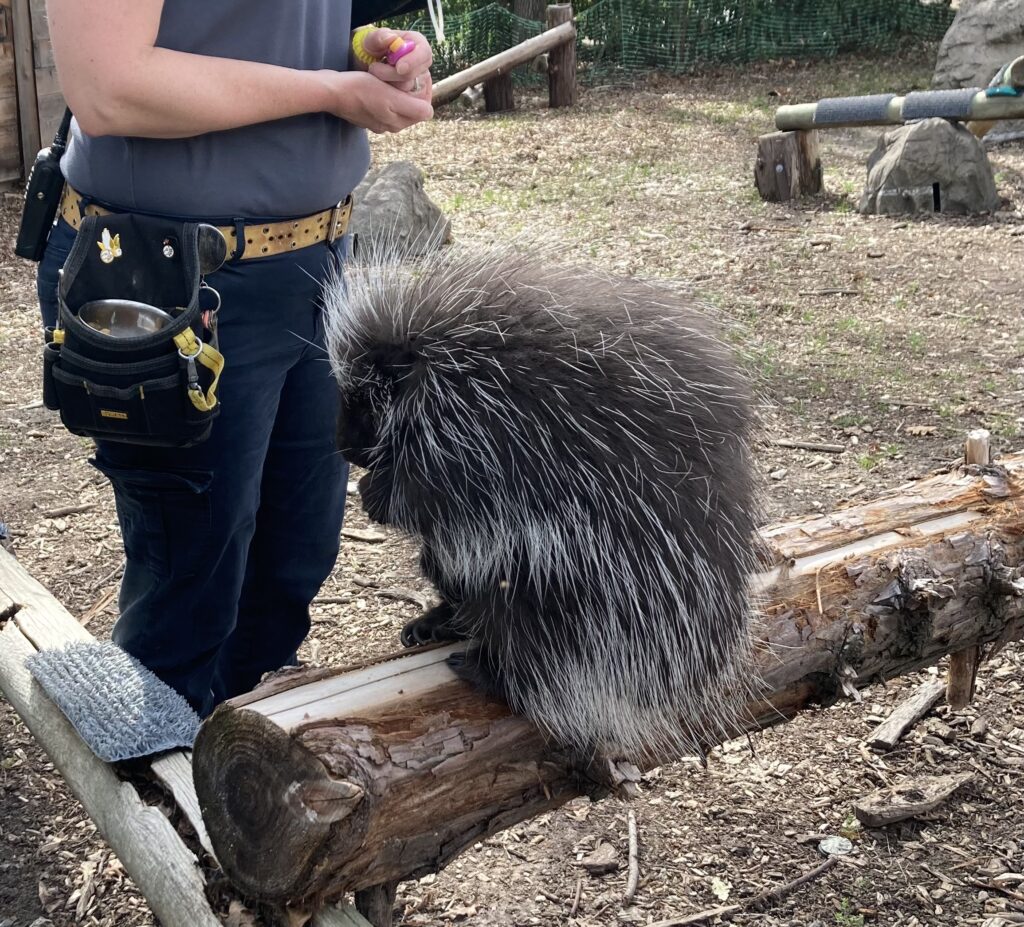 Saturday we went for what we call a ‘Three Boss Walk’, which is when we all three take a walk together. I don’t remember whether we came up with that term for walking with Genevieve or with Mulder, but sometimes I still think of it when we’re out on a weekend family walk. Saturday we found ourselves near a local park, and Maya wanted to stop at a drinking fountain for some water, which is near a little wildlife rehabilitation center and museum. They do great work in education, and they also rescue injured wildlife and release it back into the wild whenever possible. Sometimes an animal cannot be released for whatever reason (an eagle with a bad wing, for example) and they keep them and care for them there. They have a big room for parties, and if you have a birthday party there, you can tour the museum and learn about the residents. We came across just such a party, where the naturalist was talking about Penelope the Porcupine. I had never seen a porcupine in person before! She was so gentle and sweet. She came to the rehab center as a tiny baby and they bottle fed her. Is it because she was born in captivity that means she can’t be released? I’m not sure.