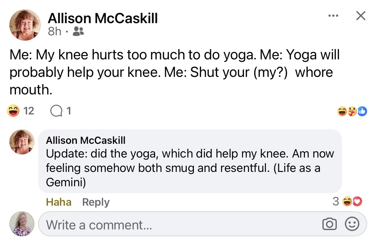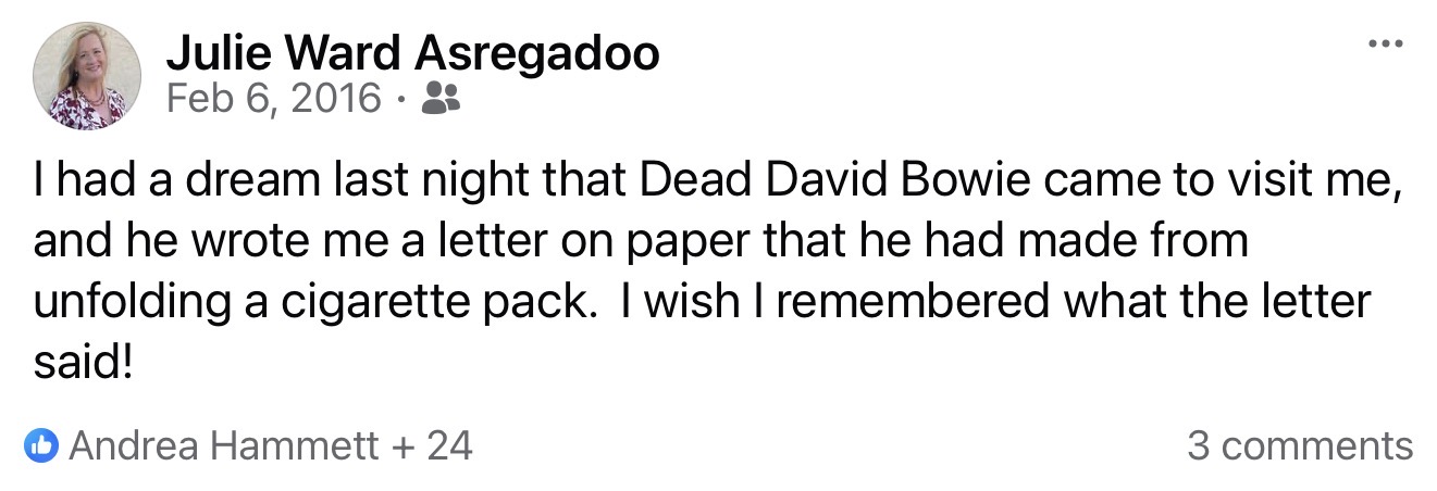 I enjoy looking at old posts on Facebook when they pop up. I mean, there are sad ones that break my heart and remind me of losses in my life, but then there are funny ones. I liked these two from February 6th. Sigh, David Bowie, my first husband. Generally when famous people die, it doesn’t bother me much. I mean, I’m sad for their families, and I acknowledge their contributions to the world, but it doesn’t hurt. When David Bowie died, it hurt. I’ve been having dreams about him since I was about 18 though, so this wasn’t new.