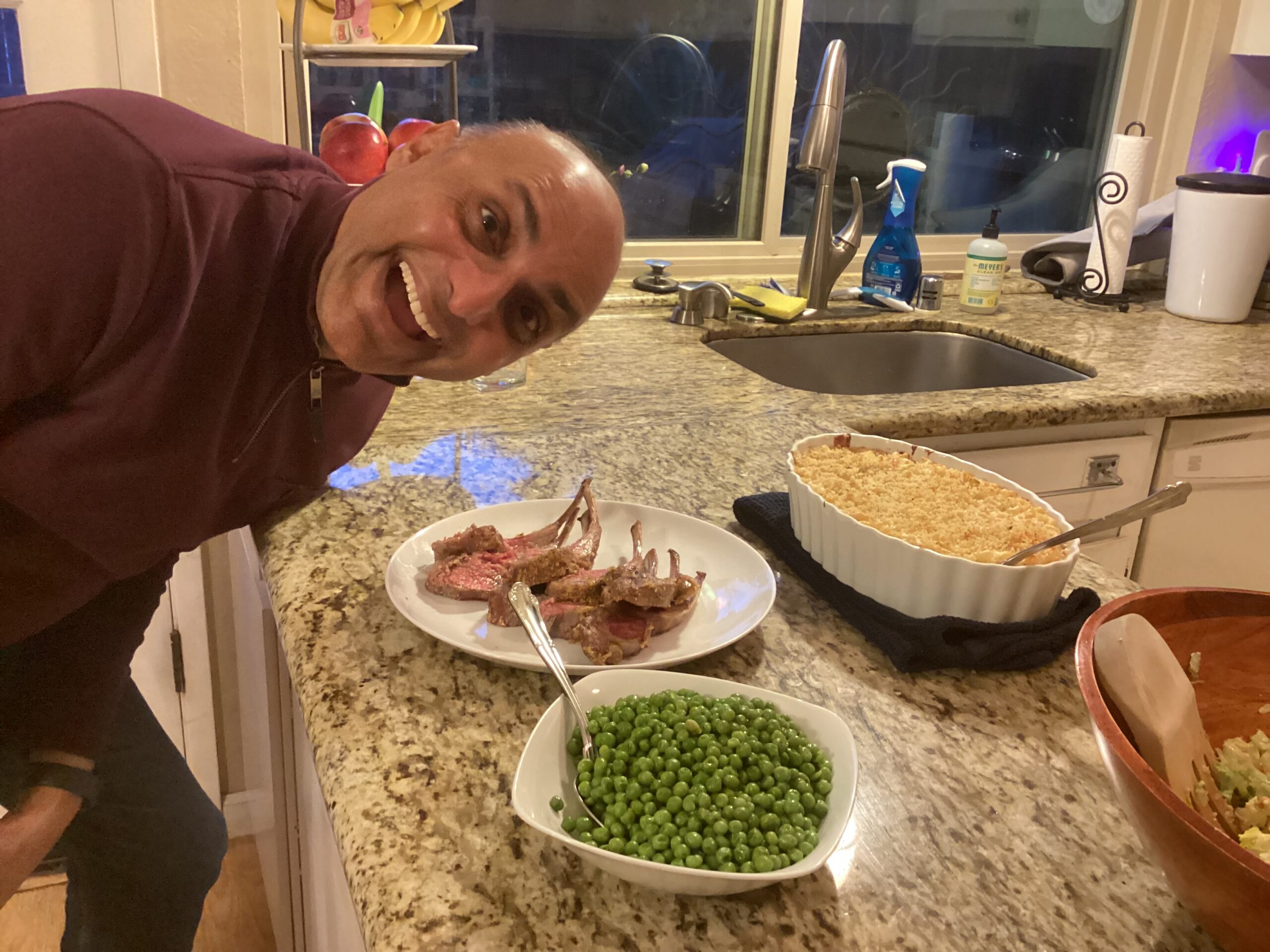 We had a lovely Valentine’s Day dinner! Ted made rack of lamb, I made mac and cheese, and we added peas and salad to the mix. Maya bought a bottle of champagne, and Ted bought a bottle of red wine. Everything was delicious, though we forgot to buy any chocolate for dessert, so ended up eating a high protein chocolate bar thing that I bought Ted for his Christmas stocking, that I got at 7-11.