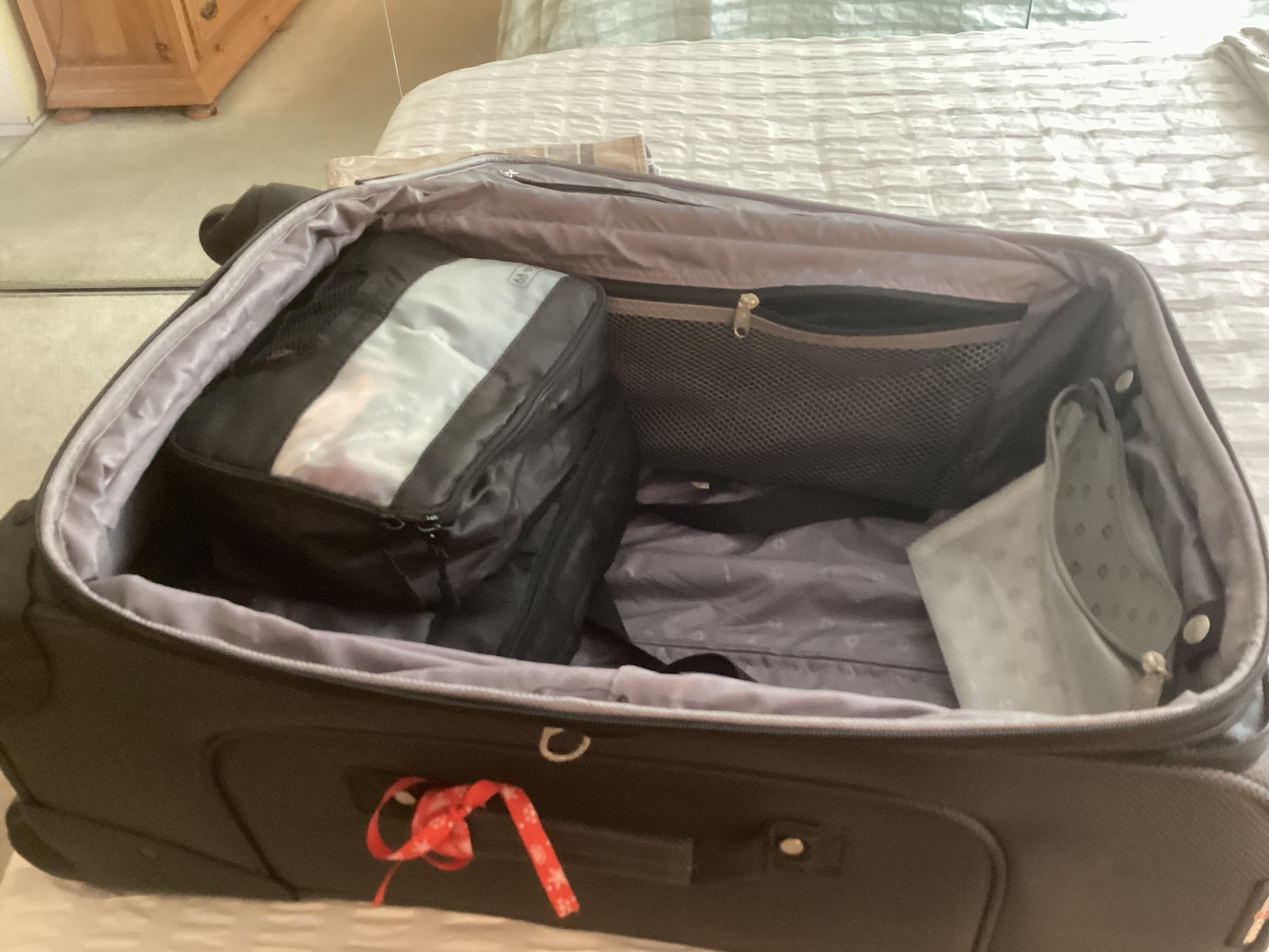 Do you use packing cubes? A few years ago when we were in Alaska, we all shared one suitcase and as we were moving from place to place every couple of days, we never unpacked. It drove me crazy looking for socks in the dark while trying not to wake anyone up, in a suitcase full of everyone’s clothes. When we got home, I bought some packing cubes, and I really like them. I like having one type of clothes in a cube, separated from everything else. Like, socks and underwear, blouses, workout clothes, shoes. Maya and I shared a big suitcase, Ted used a smaller one. This is my clothes for the trip.