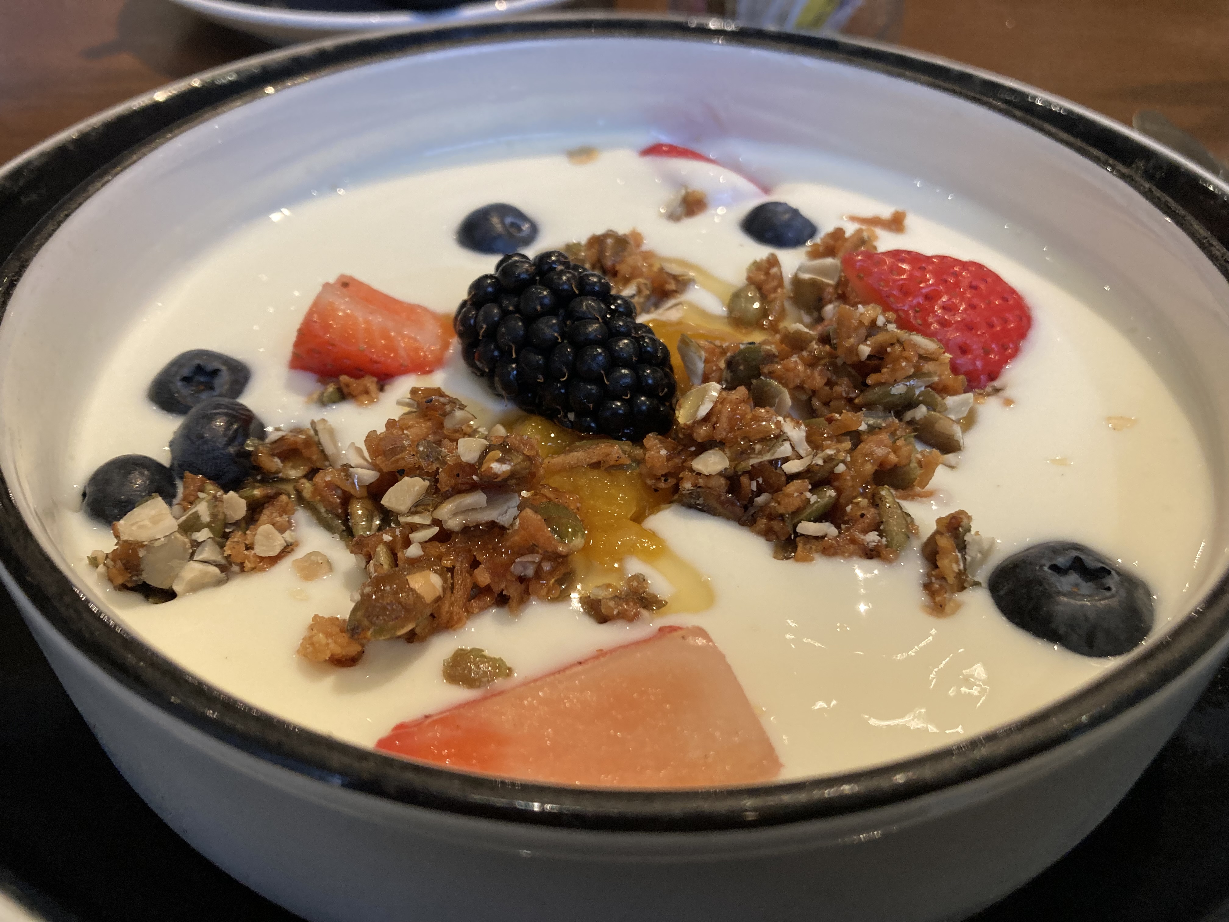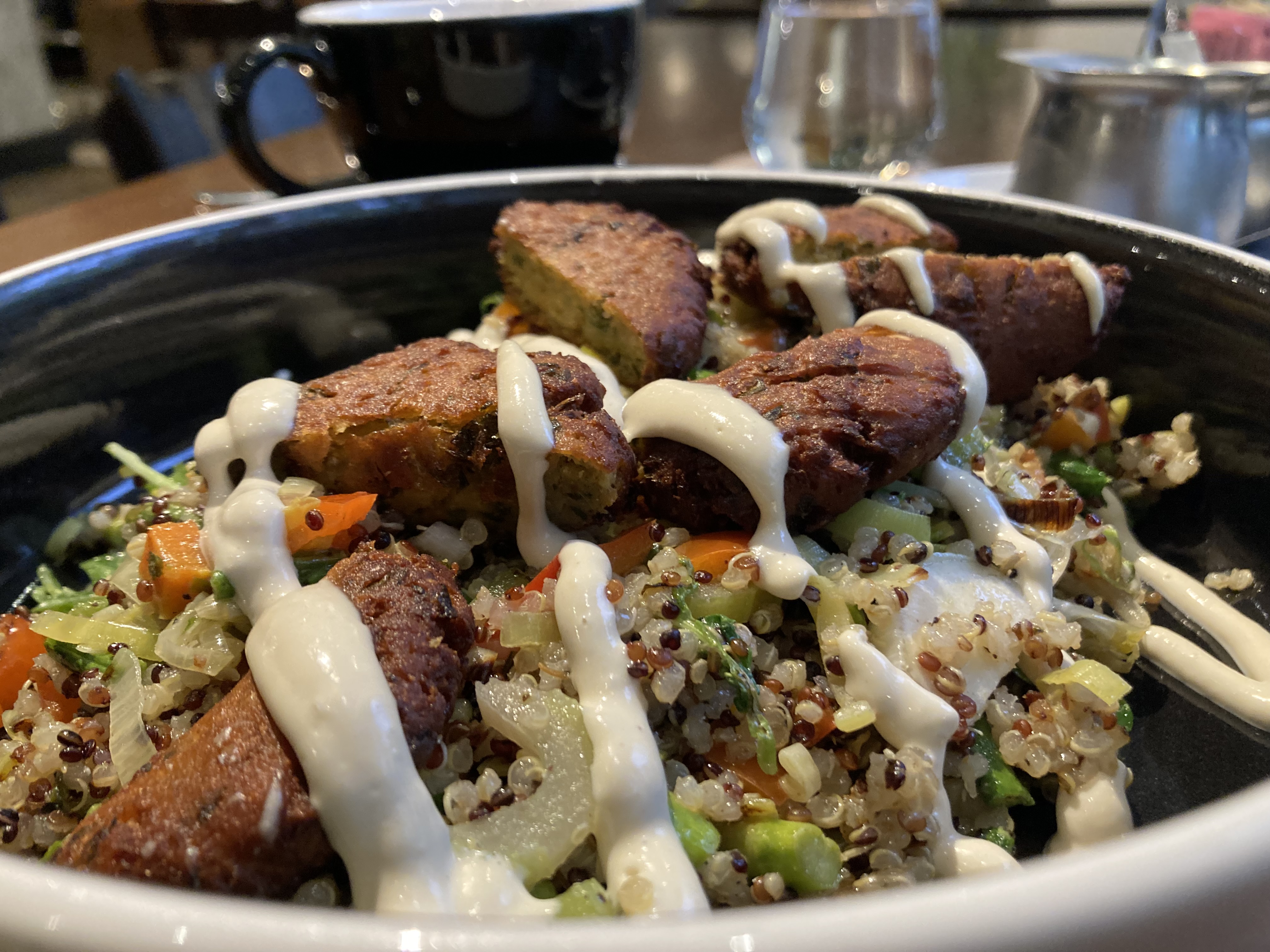 Our hotel had a $15 daily food credit if you ate in the hotel, so we had our breakfasts there every morning. Don’t worry, you’re not going to get pictures of all of our meals, but this is our breakfast Saturday morning. I had yogurt and toast, and Ted had a delicious dish called the Broadway Bowl (the hotel is on Broadway Street), which is described as: chickpea fritter, local grains, seasonal vegetables, citrus tahini. The local grain while we were there was quinoa, and he loved this breakfast so much, he had it every day. I tasted it, it was really good. Maybe I should try to figure out how to make chickpea fritters (isn’t that falafel? Maybe not, the spices were different.) I think this would make a delicious dinner some time. I’m not sure what all of the veggies were…it was all cut pretty fine. Definitely carrots and asparagus, maybe leeks or onions.