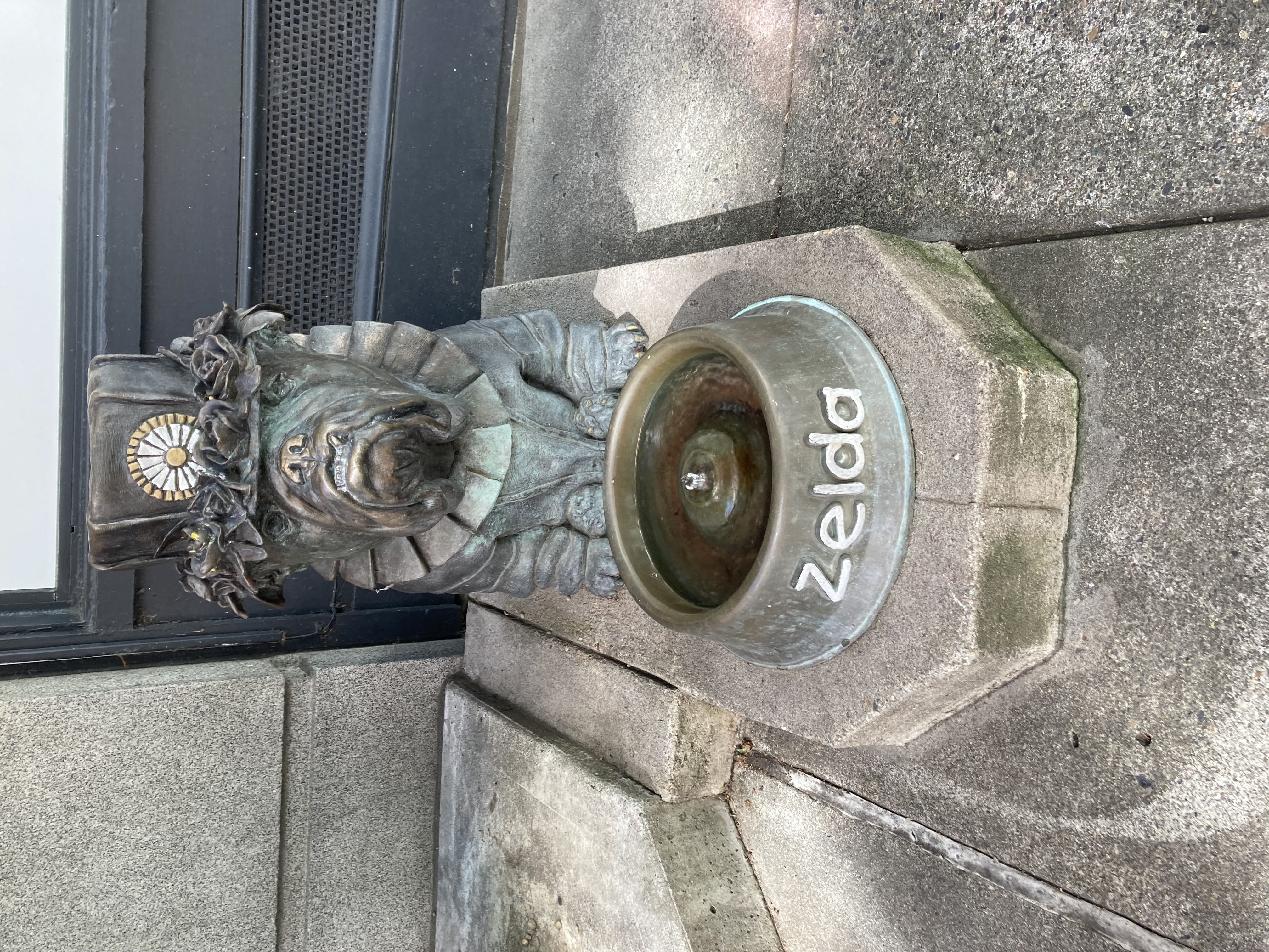 I didn’t take any pictures of our hotel, but this is Zelda, who guards the front door. The little ‘bubbler’ fountain out front is always going, with fresh water for passing dogs.
