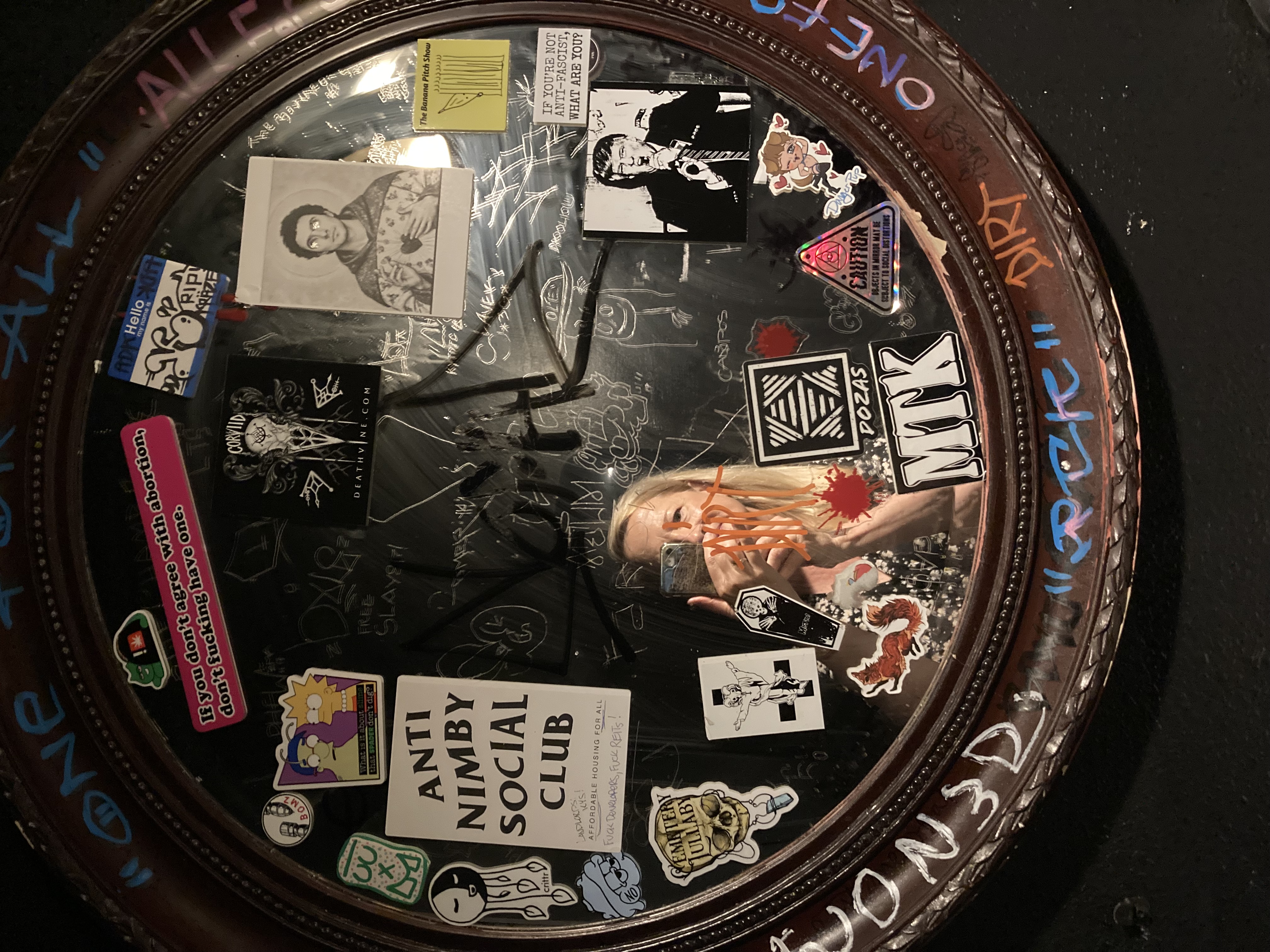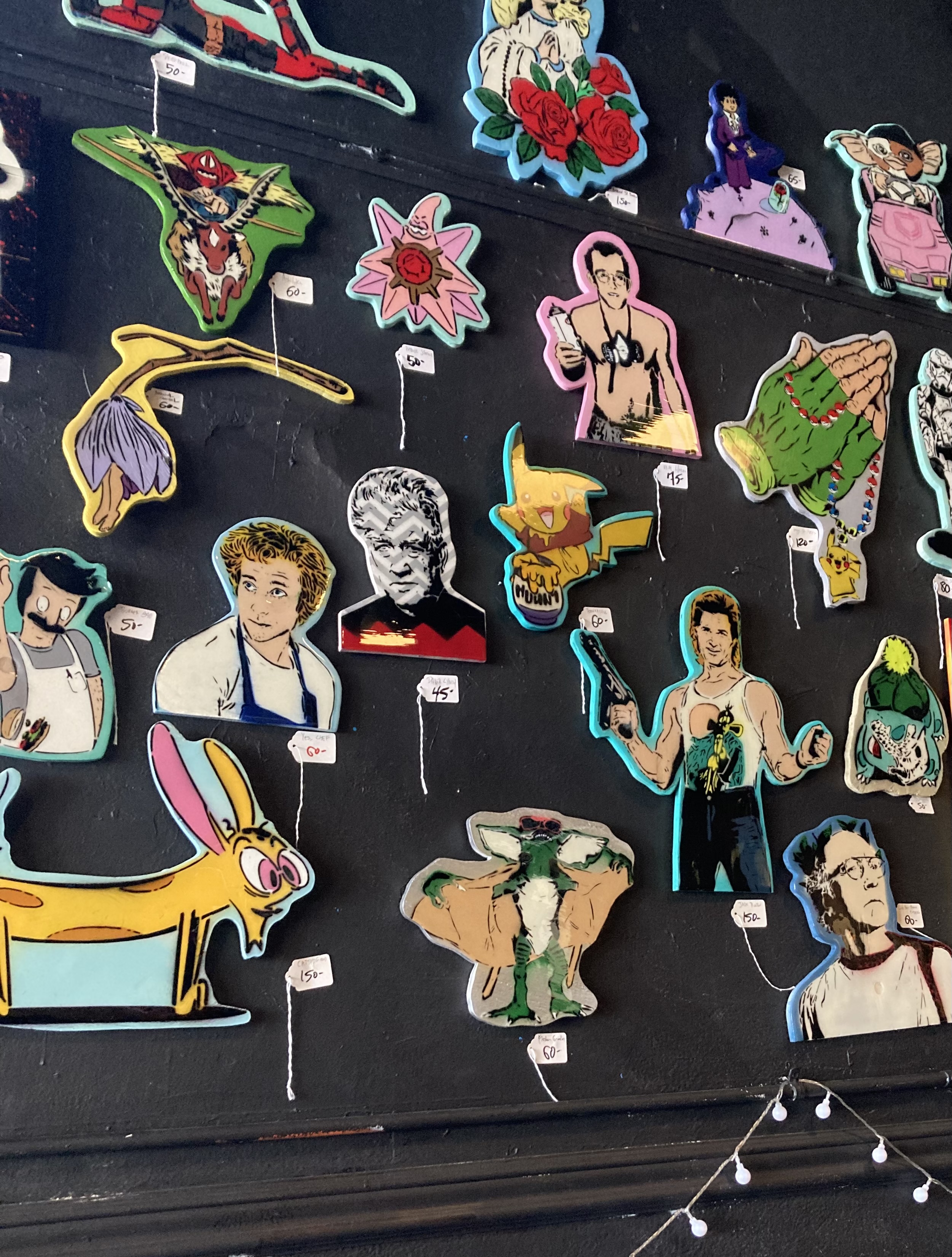 We went to the Bare Bones Cafe, which had some interesting pop culture art for sale on the walls, and a busy mirror in the bathroom. I intended to get a picture of the buff Frog & Toad artwork, but I was busy helping Joyce with her walker, and I forgot.