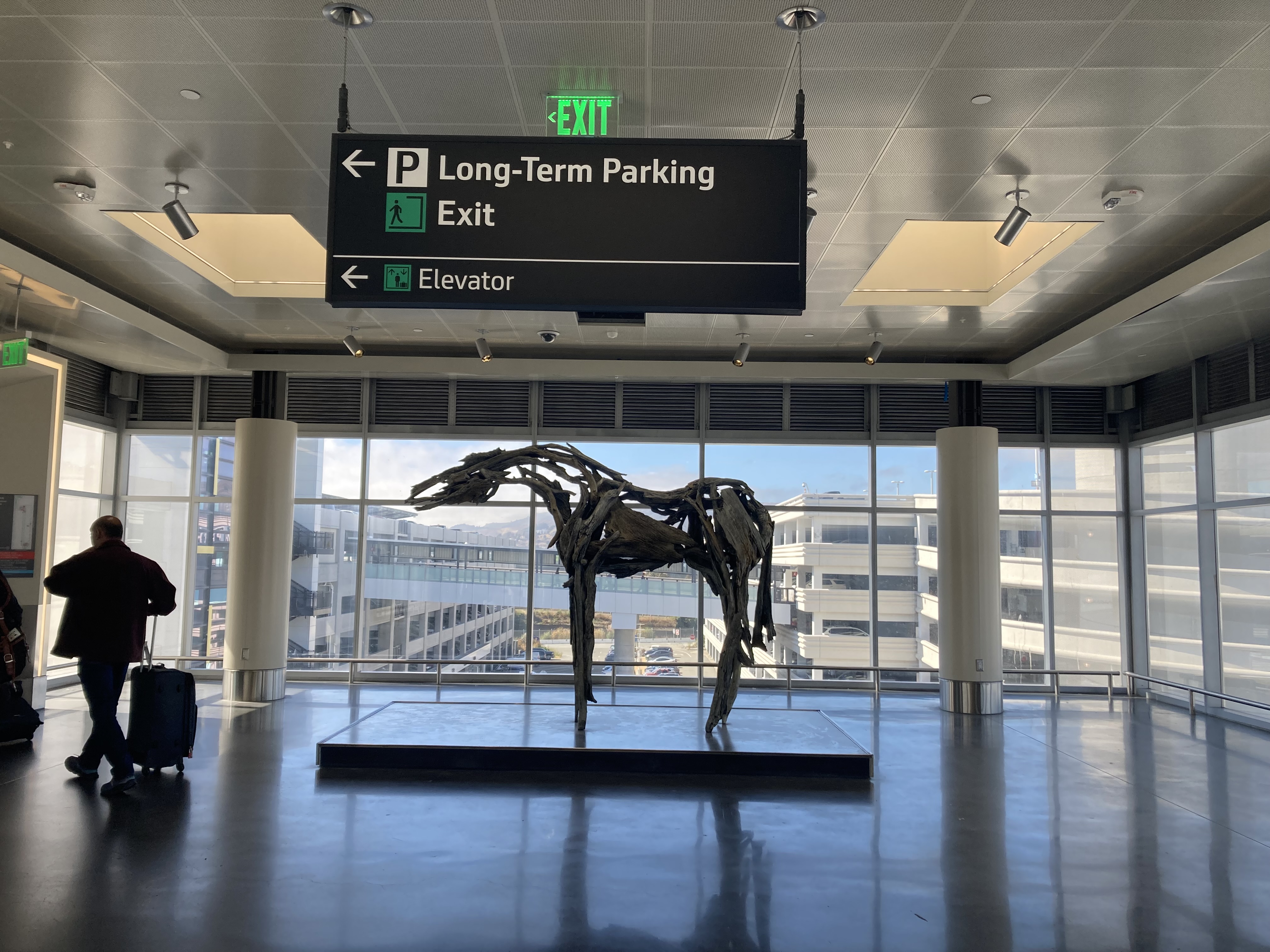 Back in San Francisco, then to long term parking, then to the drive home, which wasn’t bad. I like this horse made from bronze (but looks like driftwood), the work of artist Deborah Butterfield. She has horse sculptures at the Seattle and Portland airports as well. Welcome home!