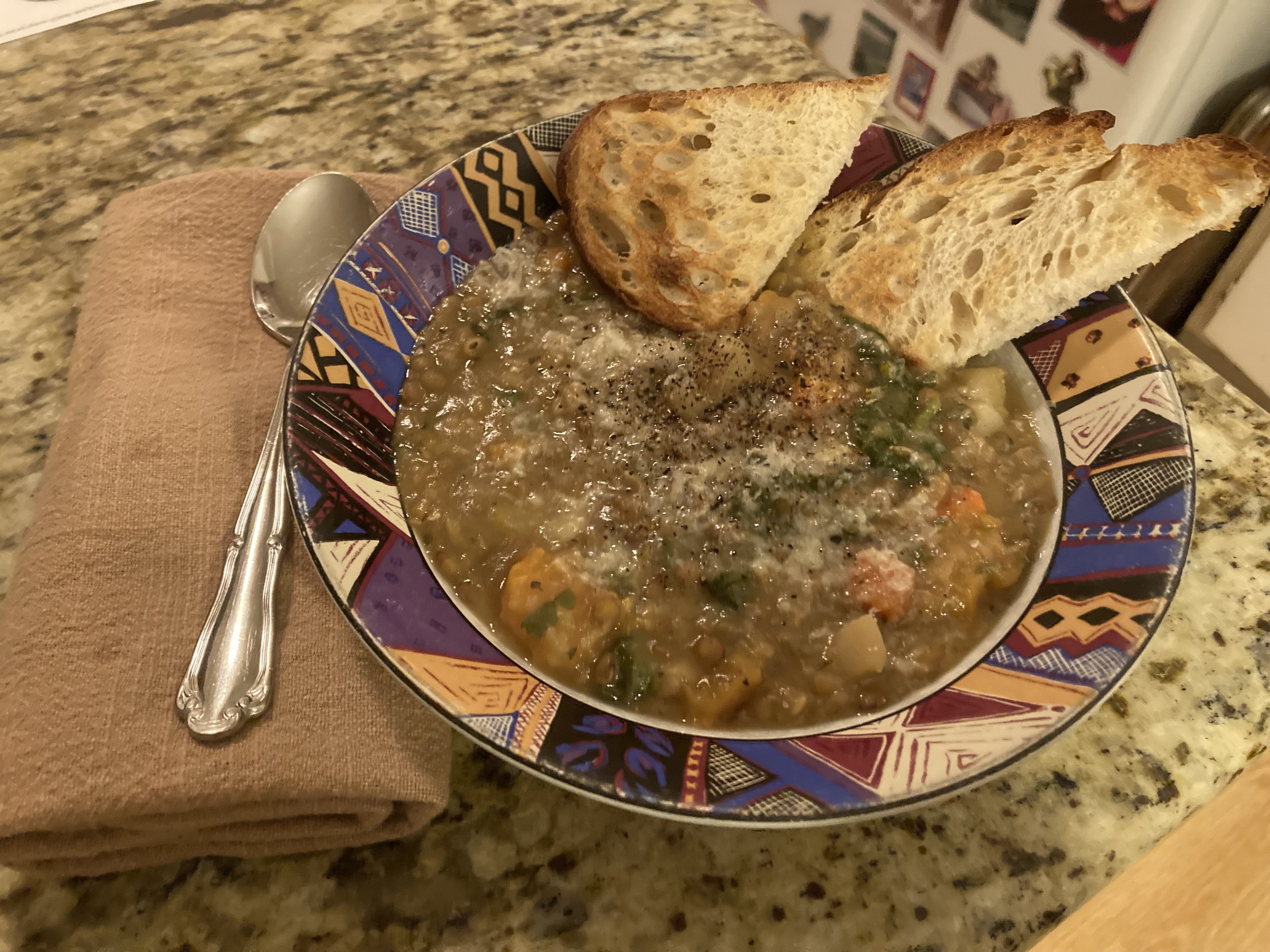 San posted a recipe the other day for a thick and creamy winter vegetable stew, and I immediately changed my menu plans for the week to include it. She found the recipe here, and simplified it and said we should all make it our own, so I looked at the original, looked at hers, and made a few changes. The original is a crock pot/slow cooker meal, and San has adapted it for the stovetop. I am a stove pot girl, I don’t have a crock pot, so I appreciated her changes. This is a tasty stew/soup, and San’s pictures are a lot nicer than mine. My changes from San’s were that I used Herbs du Province, I added a Parmesan rind to the soup, and I added some vinegar and Parmesan at the end. Kind of a combination of San’s recipe and the original.