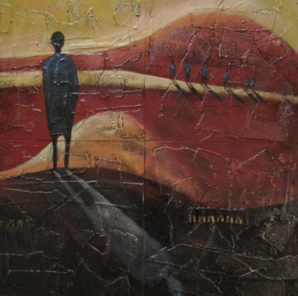 I was thinking of Nadine a lot this week, of course, and did a google search to see if I could find a link to some of her amazing paintings. She’s an artist, these days mostly a photographer (She took the first photos of Maya, when she was 2 weeks old, because our camera battery died and she lived right upstairs in our apartment building). She also paints and does pottery. My google search came up with her official photography website, and also one of her paintings on sale on eBay! I’ve always wanted to own one of her paintings, both because she’s so talented, but also to remember that time together in Philly, but I couldn’t really afford one. This one was in San Diego, and lo and behold, I could afford it! I remember when it was exhibited in a gallery in Sydney, because she sent me a flyer, which I still have. So I made an impulsive decision to buy myself a gift for my upcoming 60th birthday. I’m so glad I did. I did zero research, I thought it was a canvas, but it’s not. It’s 3D, wooden, and has a lot of texture. It’s named ‘Band of Brothers’, from her exhibit ‘African Innocence’ (she was originally from South Africa).