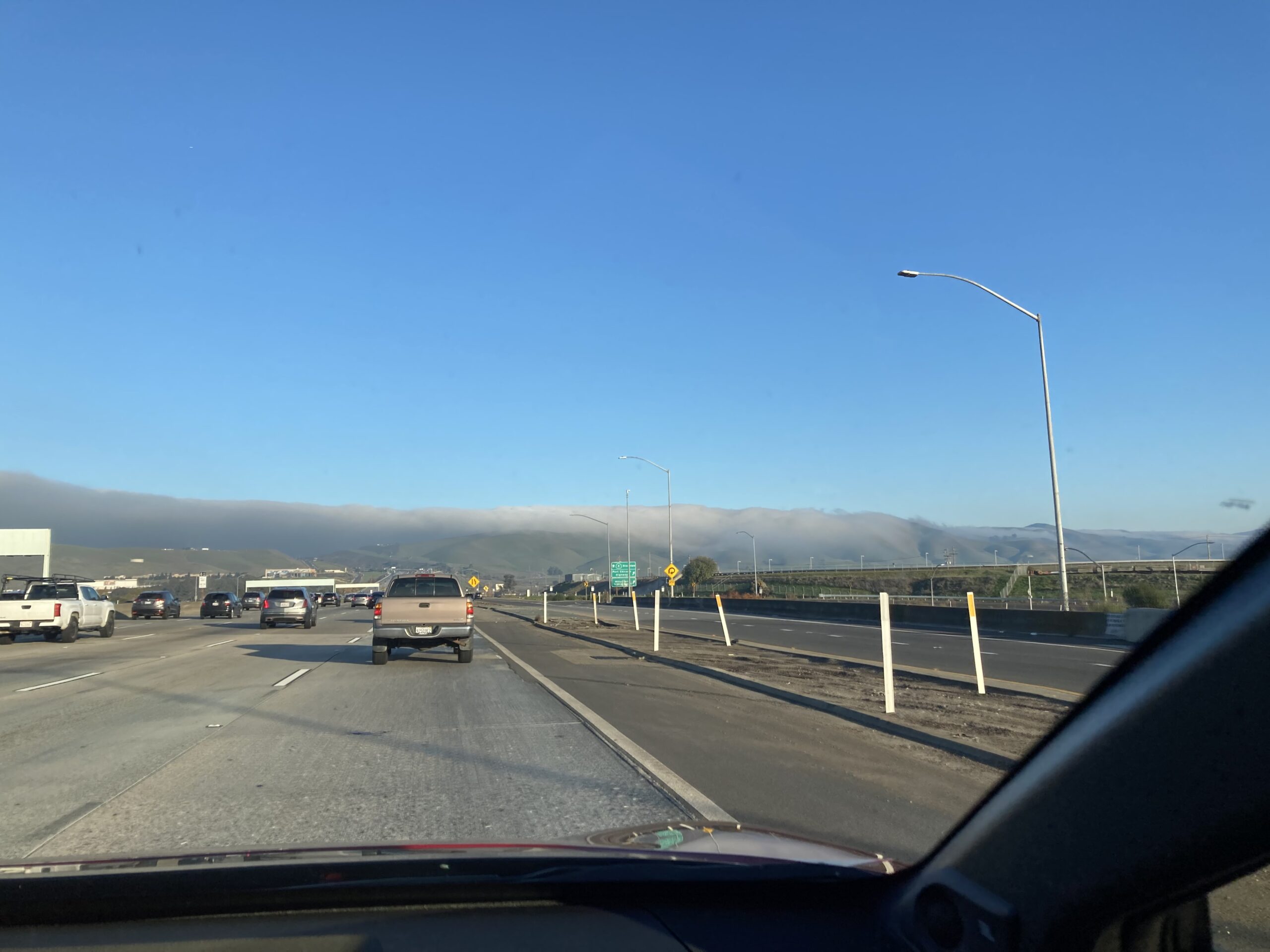 Our weather has finally changed. Can you see the low fog over the hills? For weeks we were socked in by this fog, bringing much gloom, dampness, and cold to our area. On this drive, we were in the sun, then as we passed through these hills, we were shrouded in cold, damp fog. The worst is that it also held down air pollution, so the air quality was kind of crummy. This is the air San has been dealing with longer than we did, because as you can see, as of a week ago, we had sunshine, while the valley was still socked in. Now we have rain, glorious rain. That means a lower air system, and hopefully it gives us some cleaner air once the rain clears out.