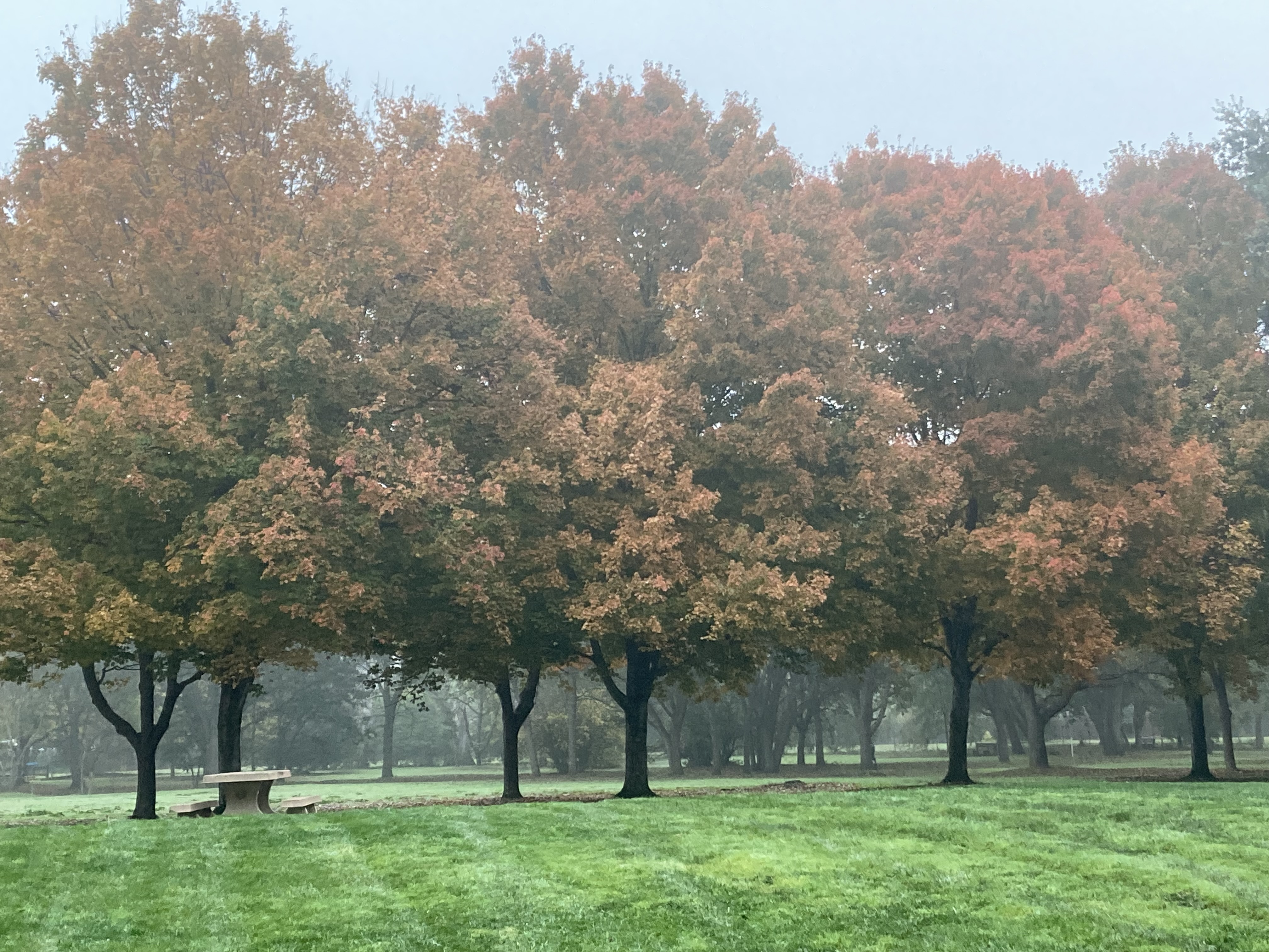 Wordless Wednesday November 26, 2025 / Obligatory autumnal scene on a foggy morning walk. I like how the trees look a little hazy through the light fog.